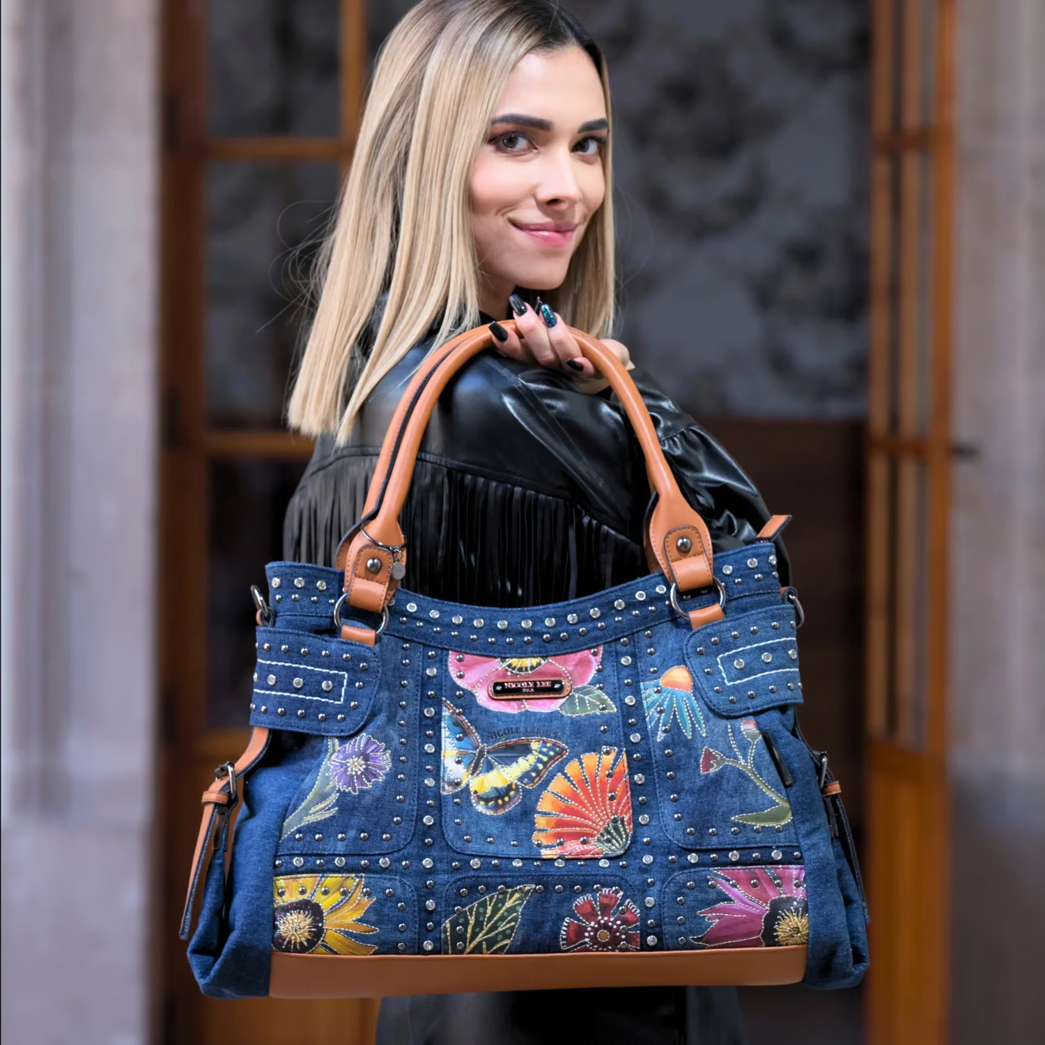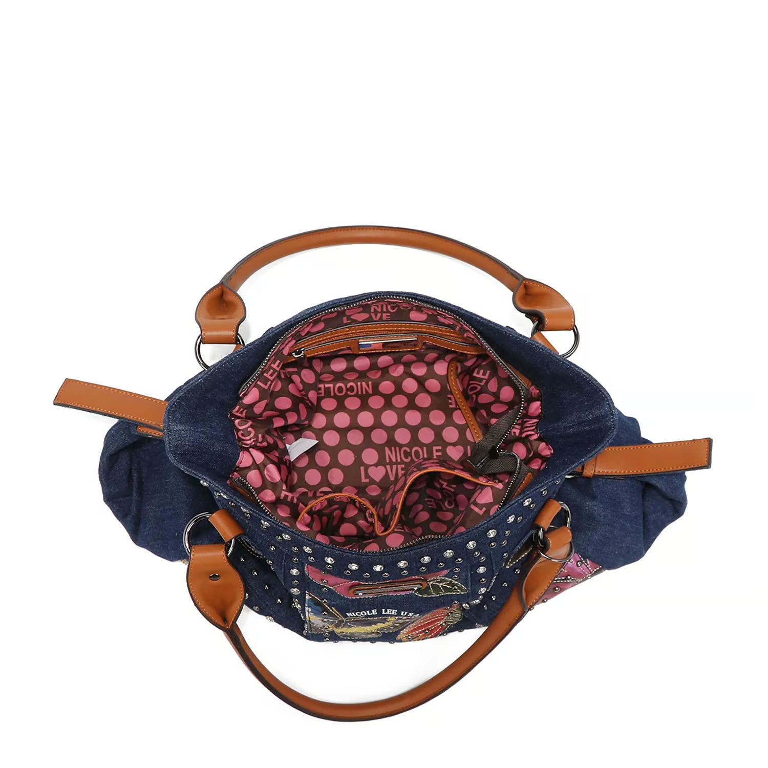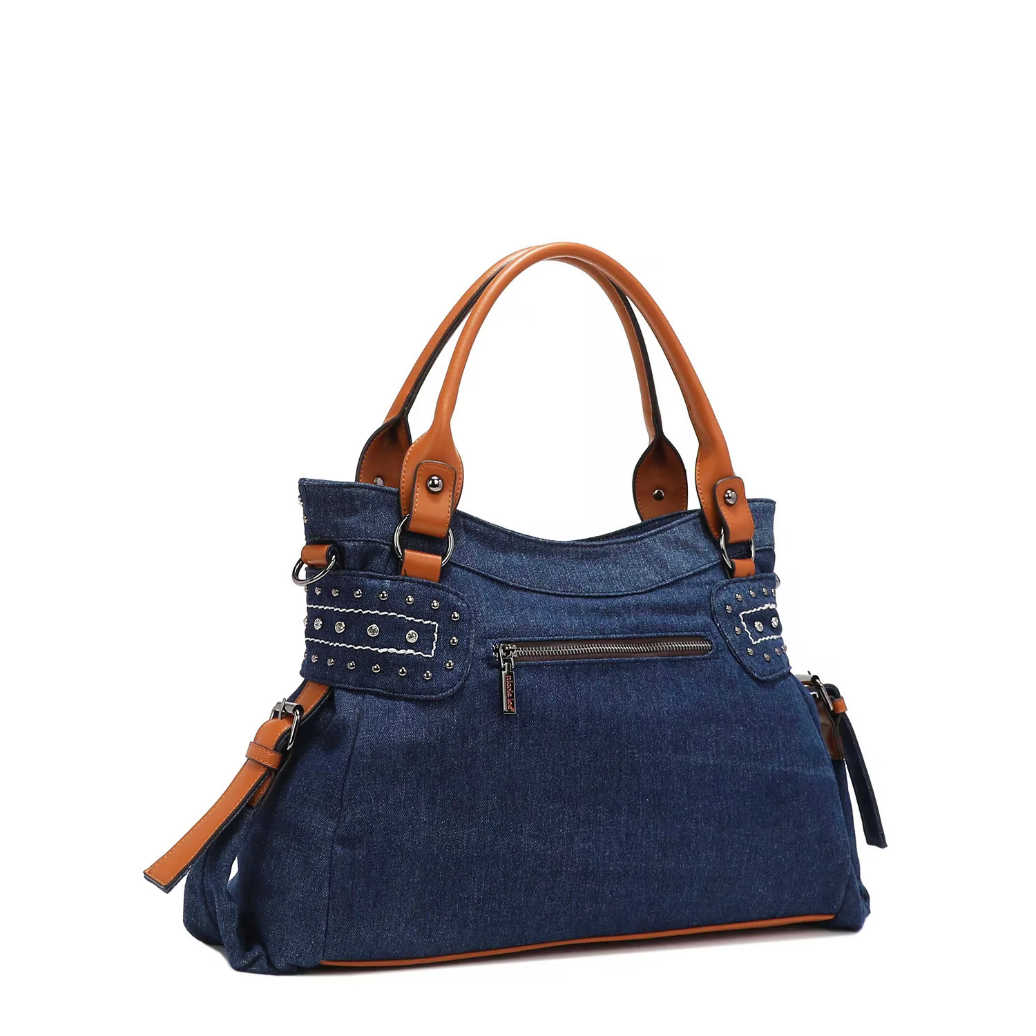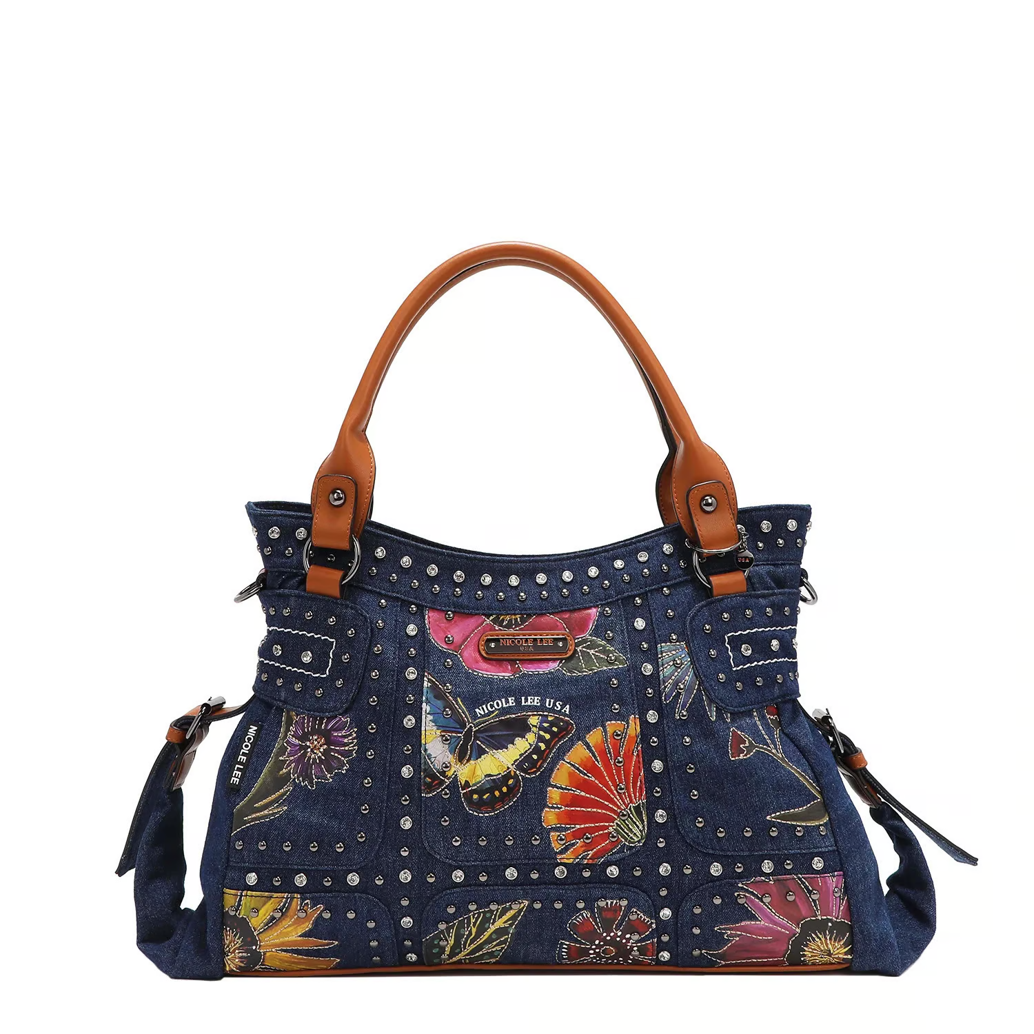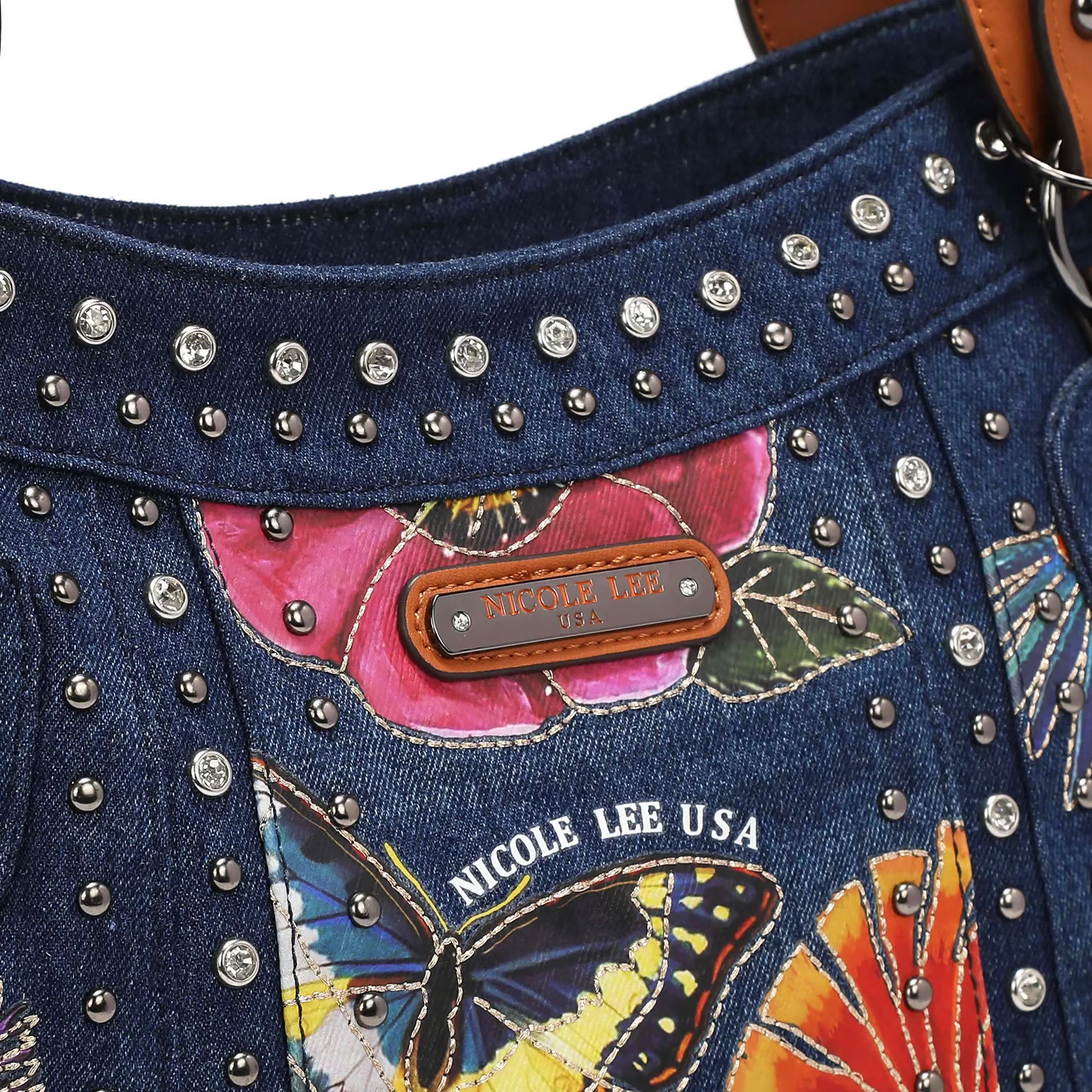 ダイヤモンドのラインストーンとスタッズが大胆に施され、モダンなスタイルながらもタイムレスに楽しめます。