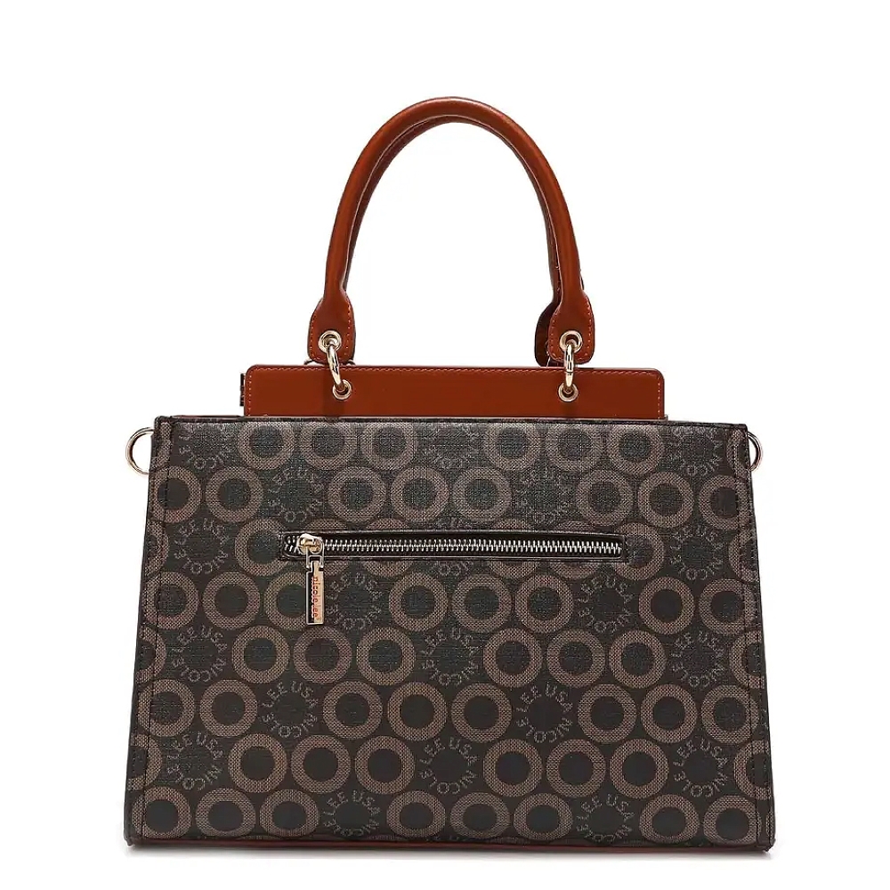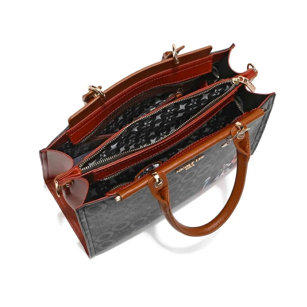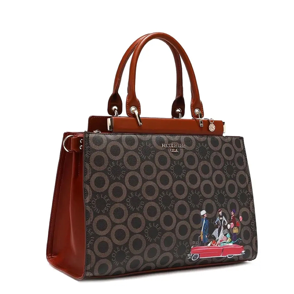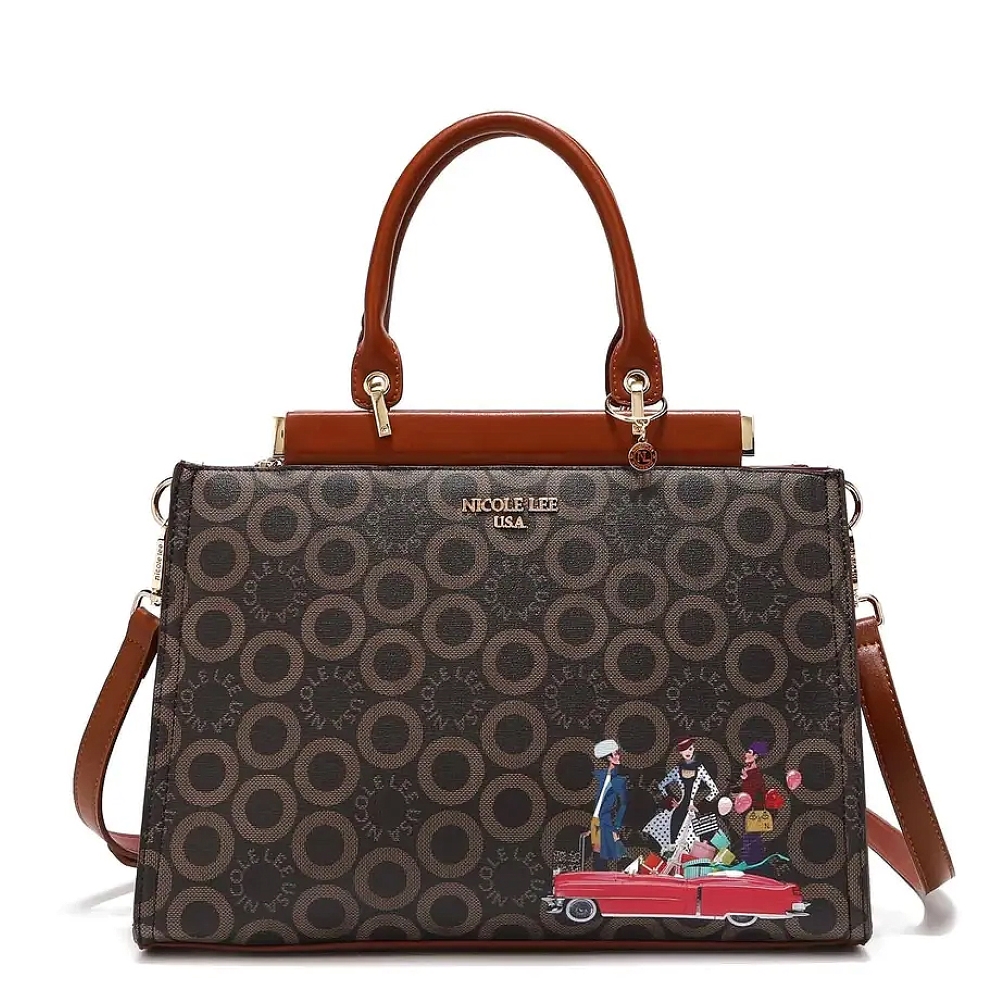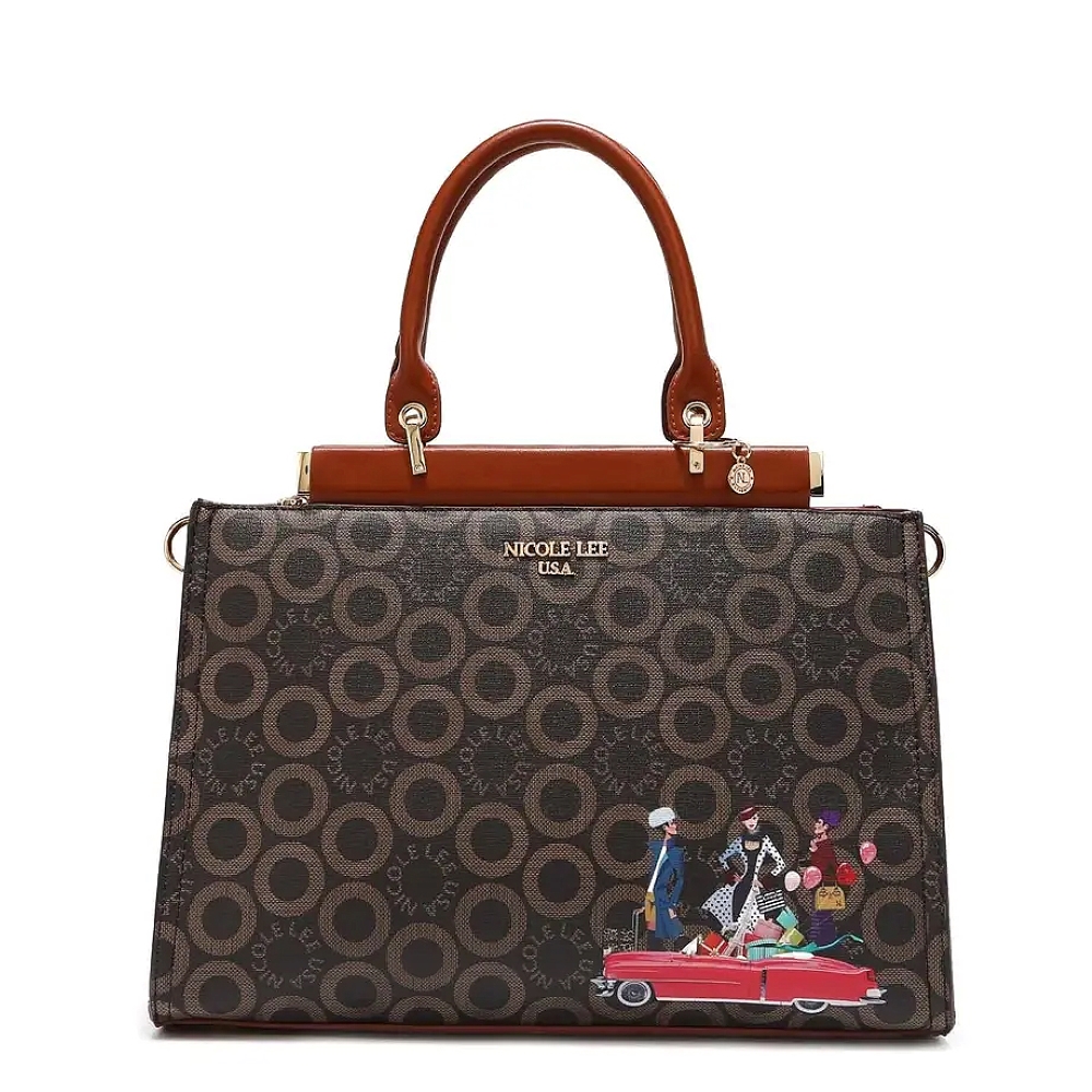 ブラウンベースにモノグラム柄とポップなイラストプリントが可愛いデザインバッグ。