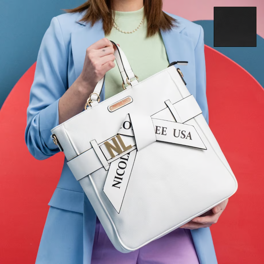 グラフィックなラインと3つのコンパートメントを備えたスタイリッシュなリボントート(ラージ)です。