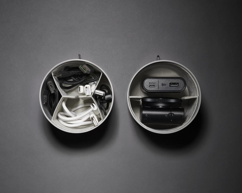 ケーブル類を多く収納する場合は4分割、アダプターなど少し大きなアクセサリーも収納する場合は2分割など、可動式仕切りを利用することで、収納物に合わせてメインスペースを0〜4分割することができます。