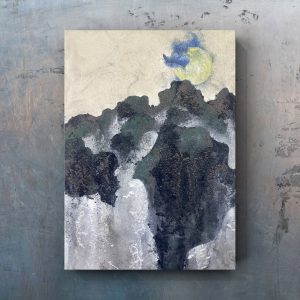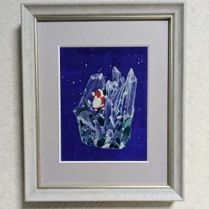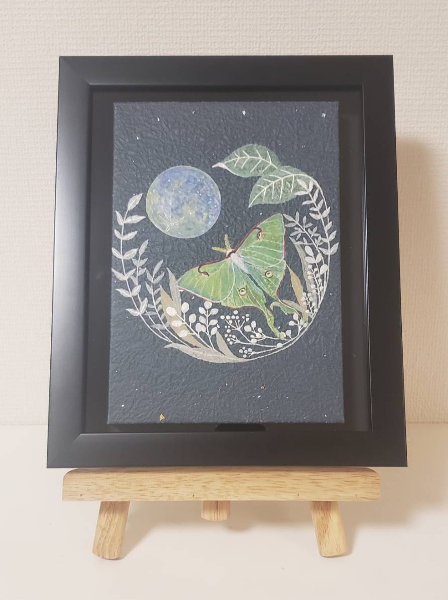 『オオミズアオ』という最も美しい蛾を描きました。神秘的な蛾に合わせ、月や植物を描き加えました。又、月の一部と植物には銀泥を使い、綺麗な色合いになっています。