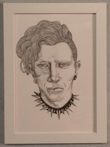 パンキッシュな彼はとても不機嫌そうな顔をしている。その首には刺々しく攻撃的なチョーカーを付けている。近づくなと言わんばかりの雰囲気を表情、アクセサリー、光で表現した。細かな線描表現でいかに迫力やグロテスクさ、ブラックユーモアな世界観を作る事が出来るかを念頭に絵を描いています。猛禽類のような目は時にアンニュイに、時に不気味に表情を変え、人であるような別の生き物であるような曖昧さを楽しんでいただきたいと思います。