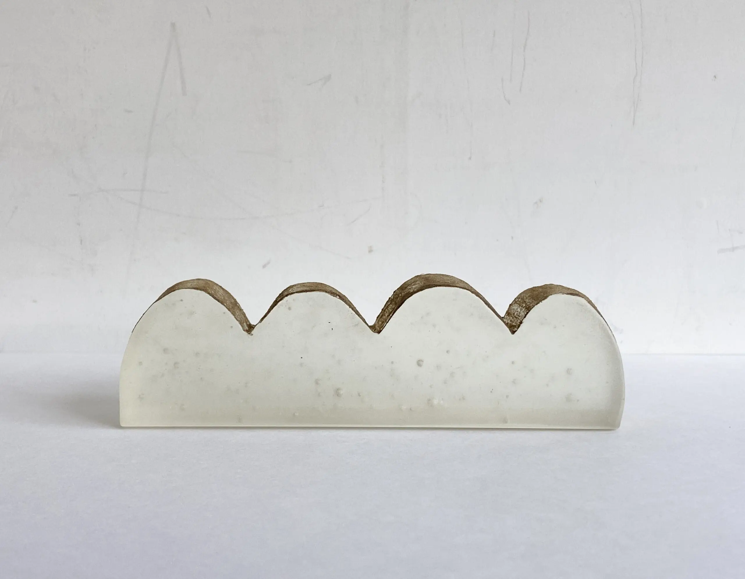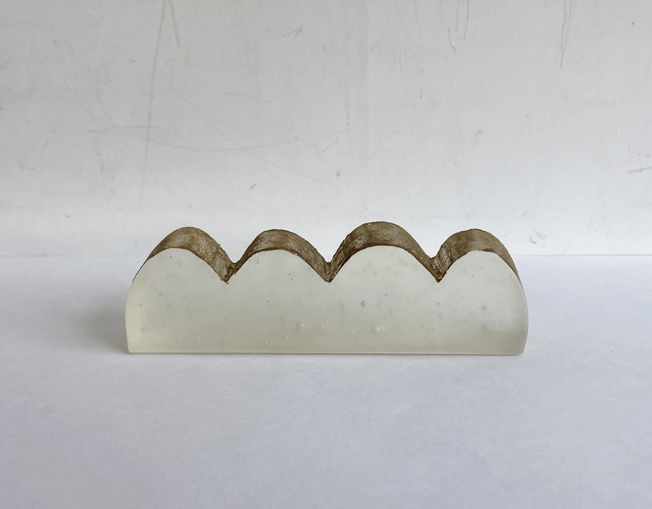 上面は土のざっらとした質感になっています。半分透けるガラスとの対比をお楽しみください。なお、土を定着させるため膠(にかわ)を使用しております。膠は水に溶けやすいため、水をつけないようご注意ください。