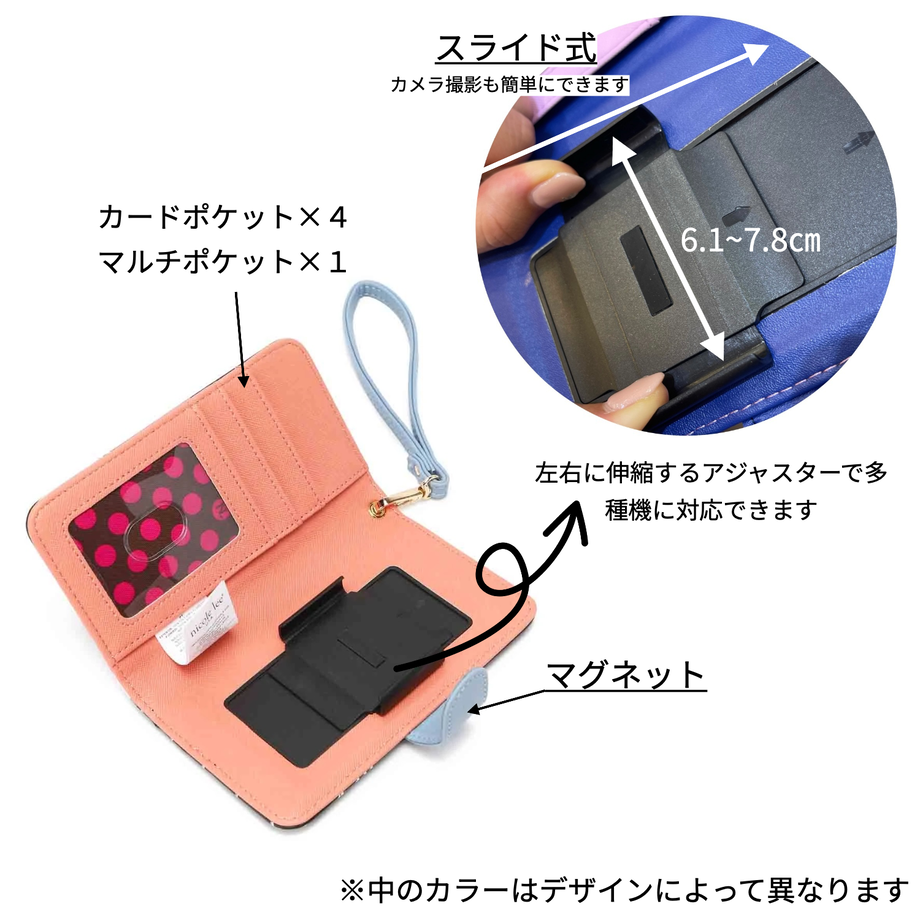 スマホの幅に合わせてセッティングできます。 中はカード、定期券も入るパスケースタイプ。 取り外し可能なストラップなので自分で好きなストラップにアレンジできます。