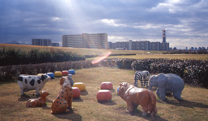 昼下がりの遊歩道、雲間から光がさしていた。光の下には動物たちが何やら話しているような光景が。普段は子供たちを楽しませている遊具の動物たち。人気のない時間に彼らの声を聞いた気がした。