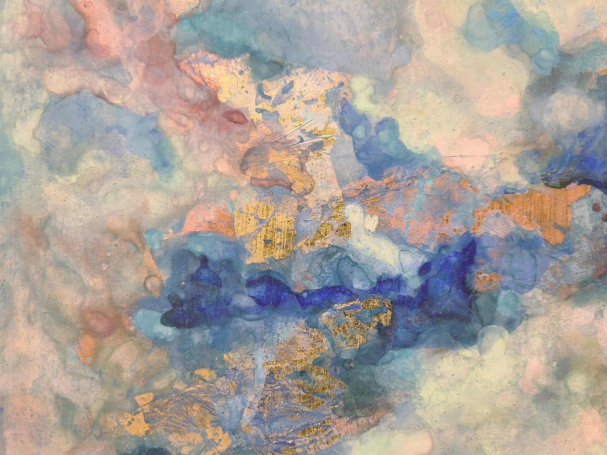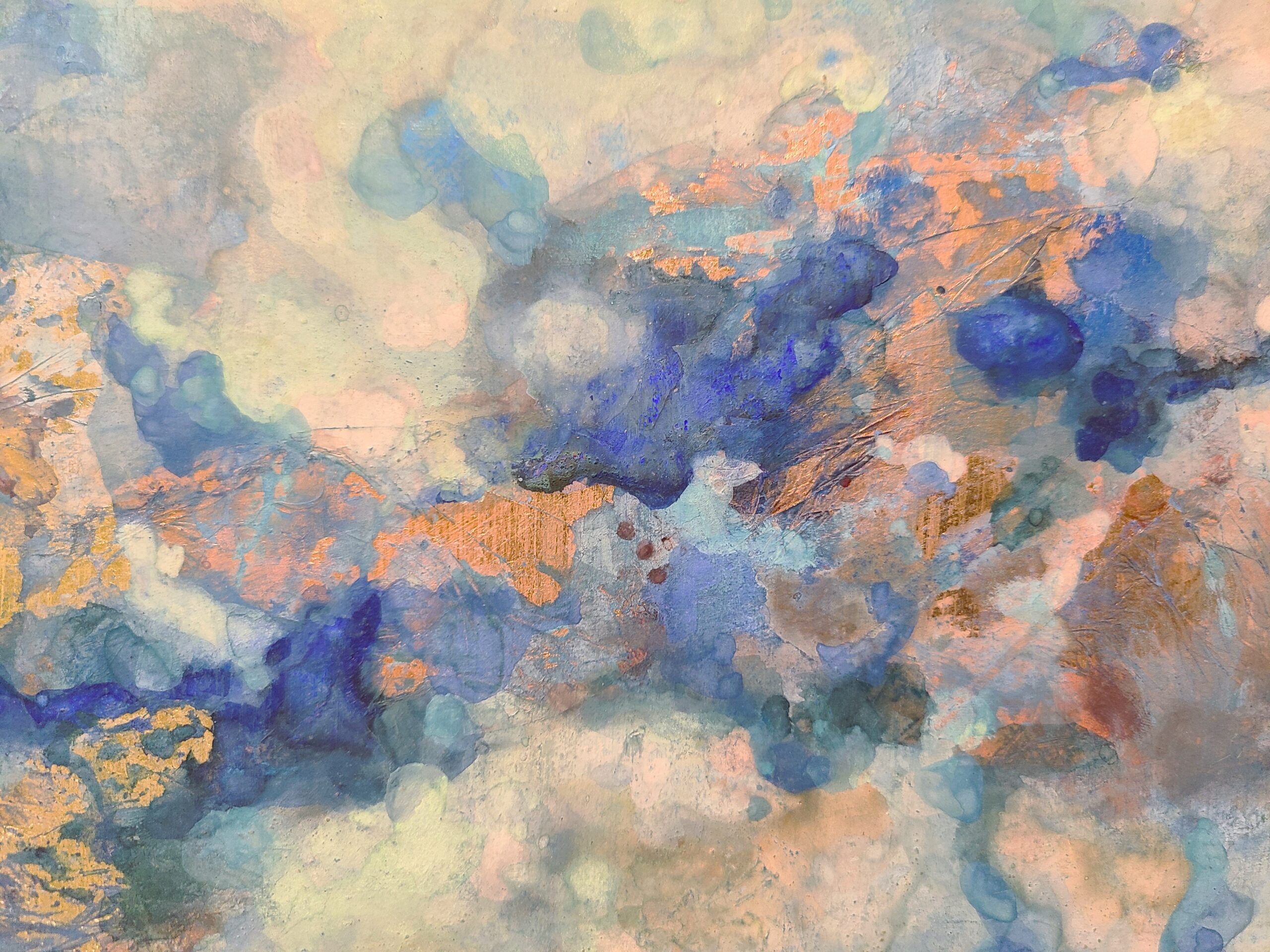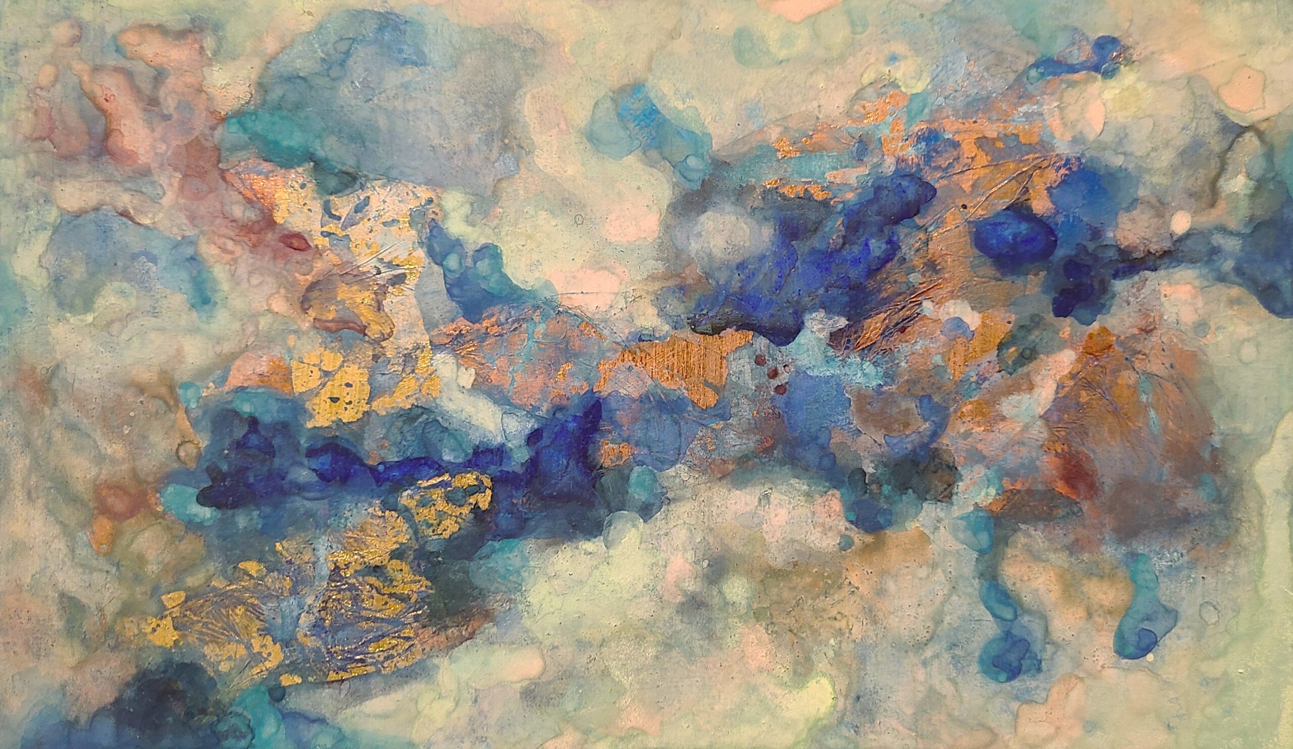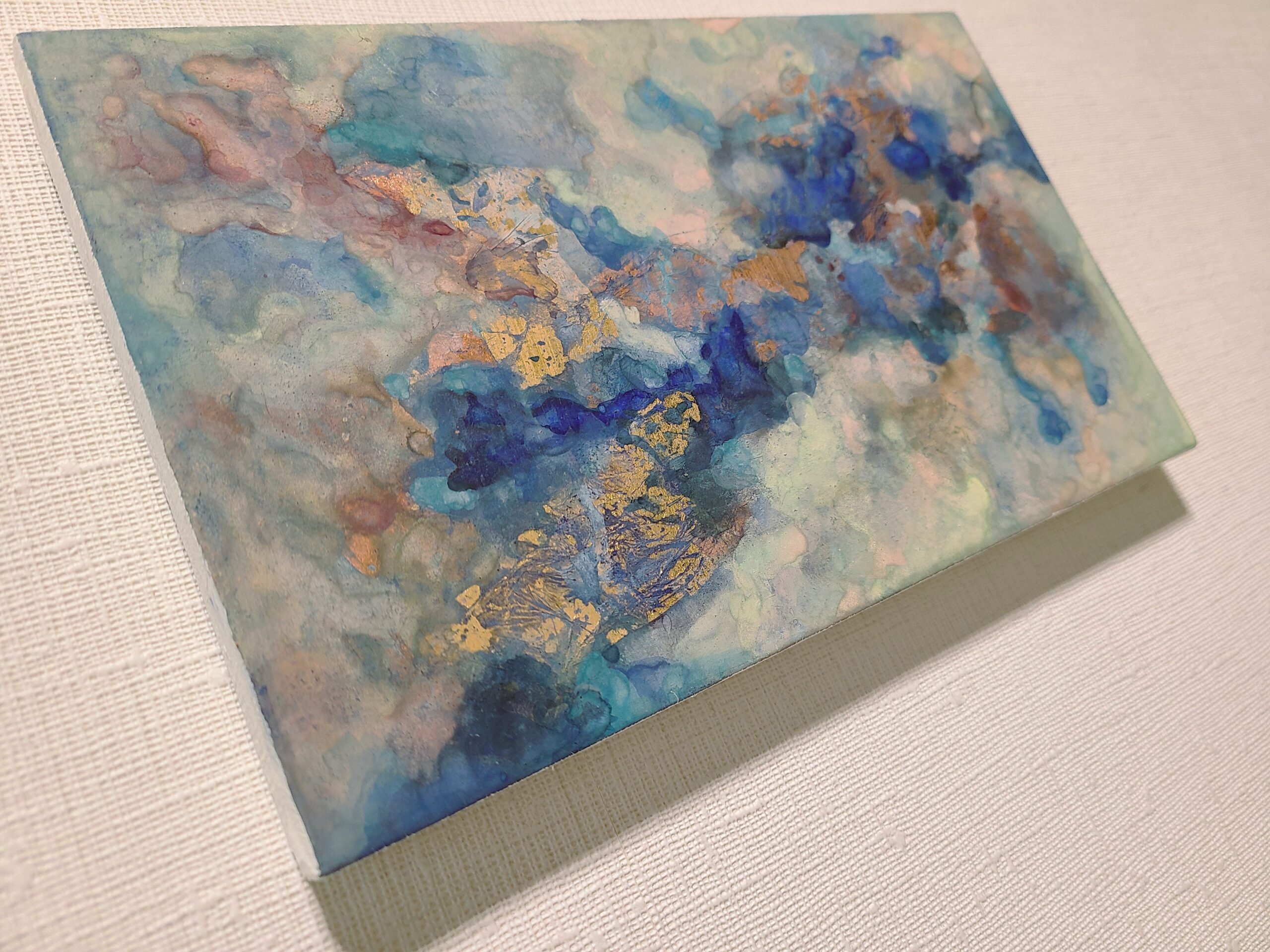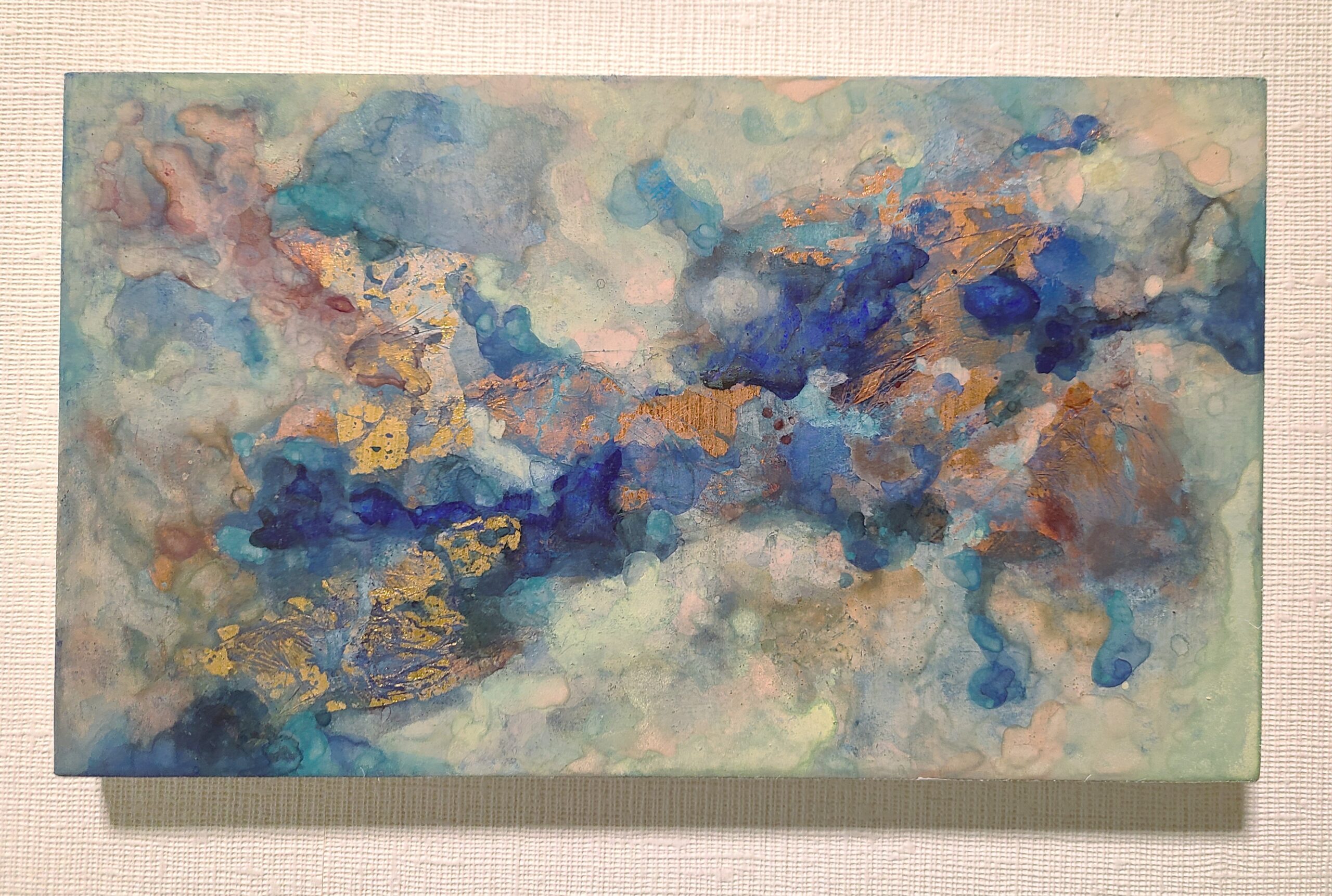 油膜とは水や物体の表面にできる油の膜、本作は水の上に広がった独特の輝きと移ろいゆく様を表現しました。