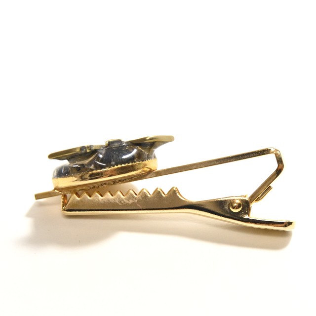 マットブラックの砕いたガラスと、ゴールドのパーツのコントラストが美しいネクタイピン。