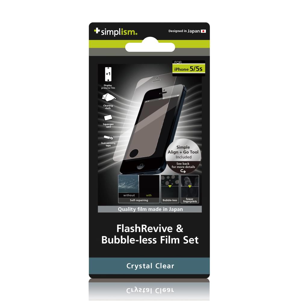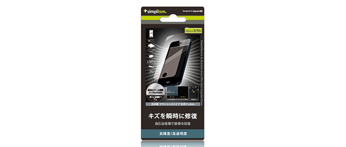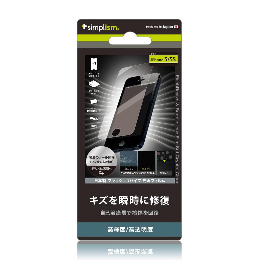 Simplism FlashRevive & Bubble-less Film Set for iPhone Crystal Clear(iPhone用 瞬間傷修復&バブルレス保護フィルムセット(クリスタルクリア))は、iPhoneのディスプレイ部を、傷や汚れからしっかりと守る透明感溢れる光沢タイプの保護フィルムです。