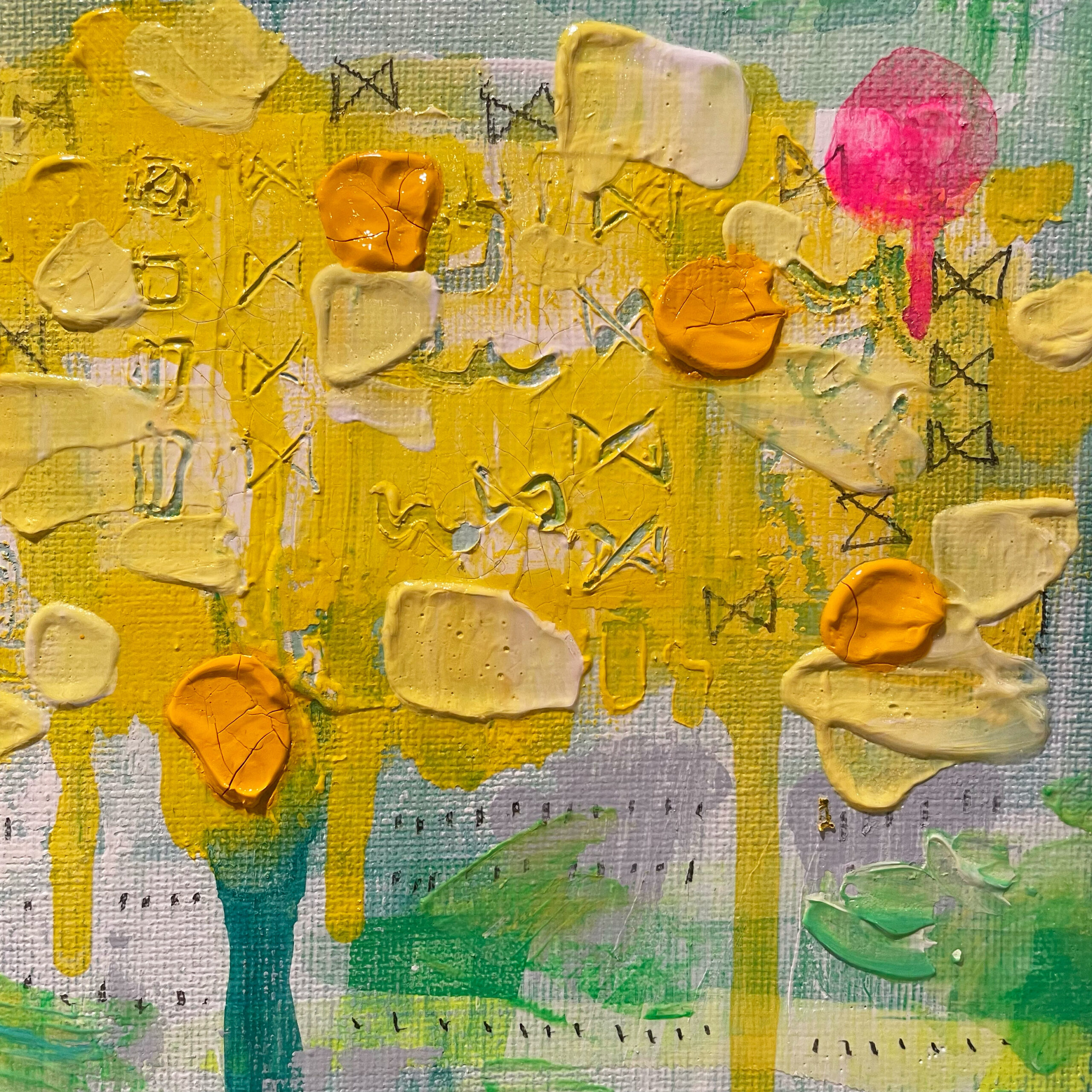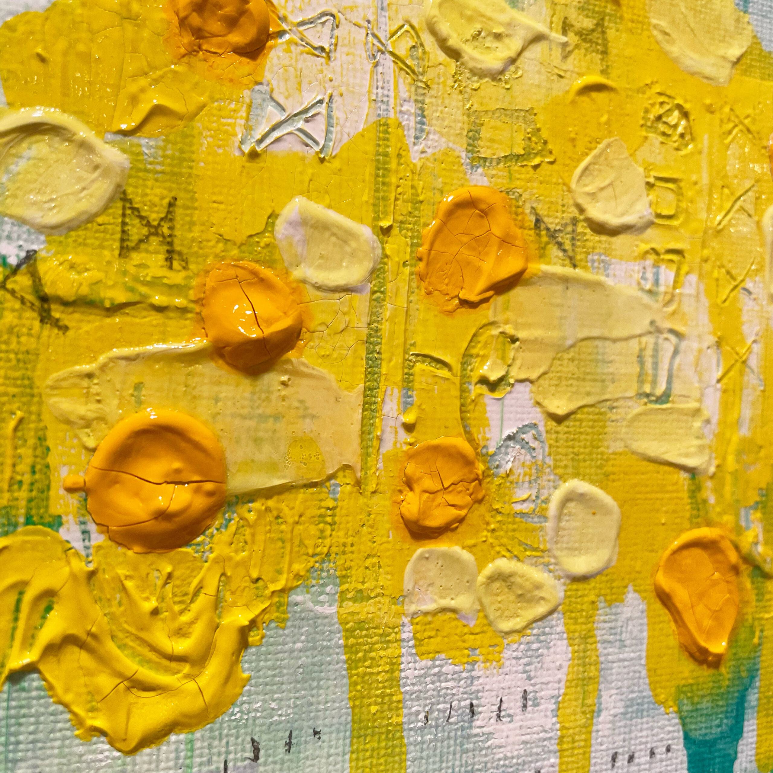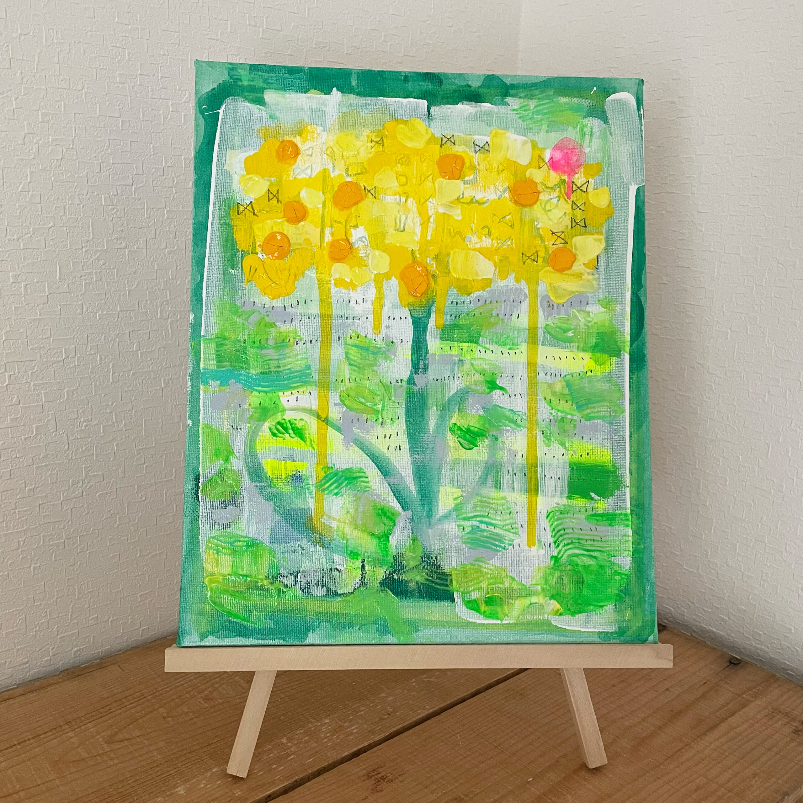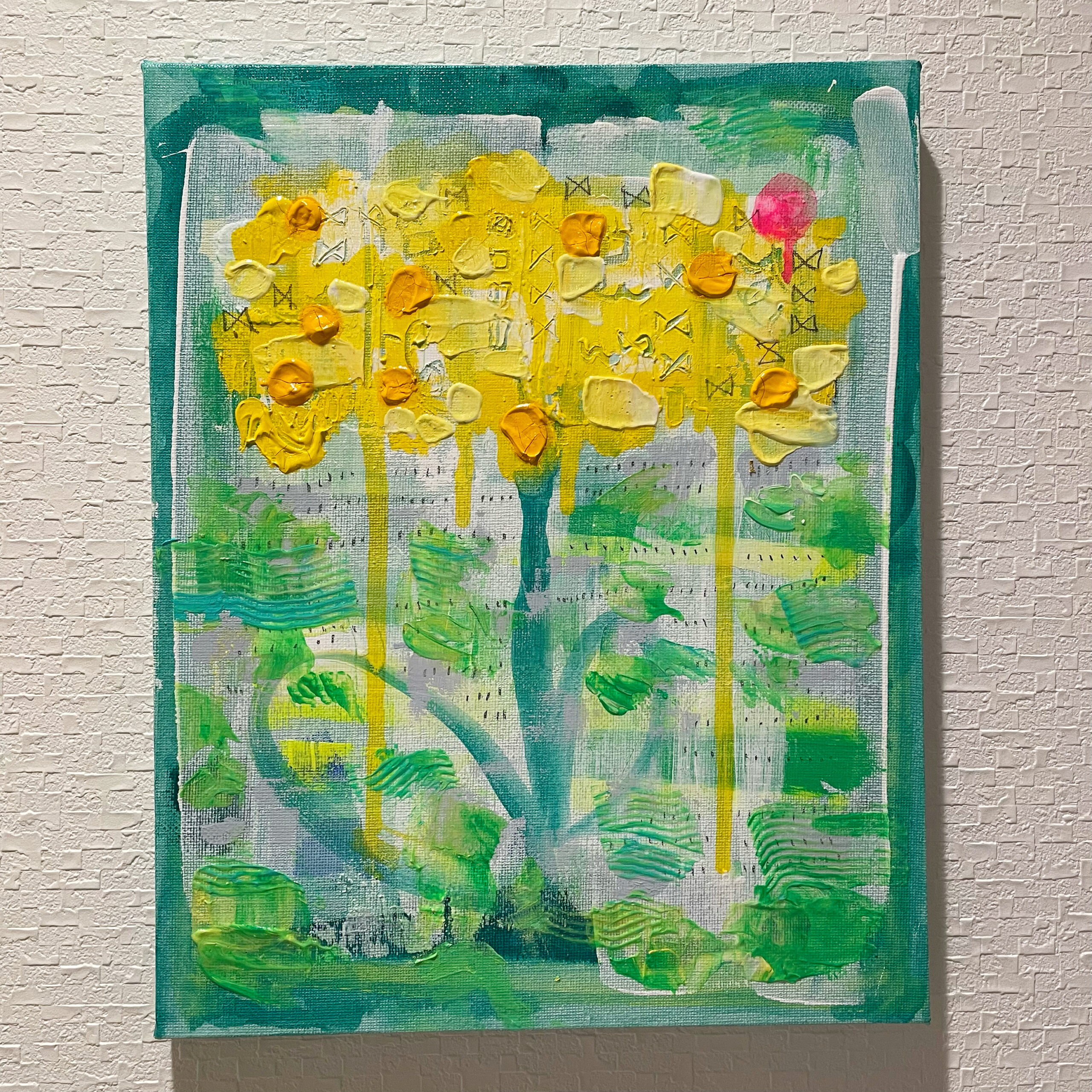 黄色の花に蝶々がいる様子をイメージしましたが抽象画ですのでいろいろ想像して楽しんで頂けたら嬉しいです。