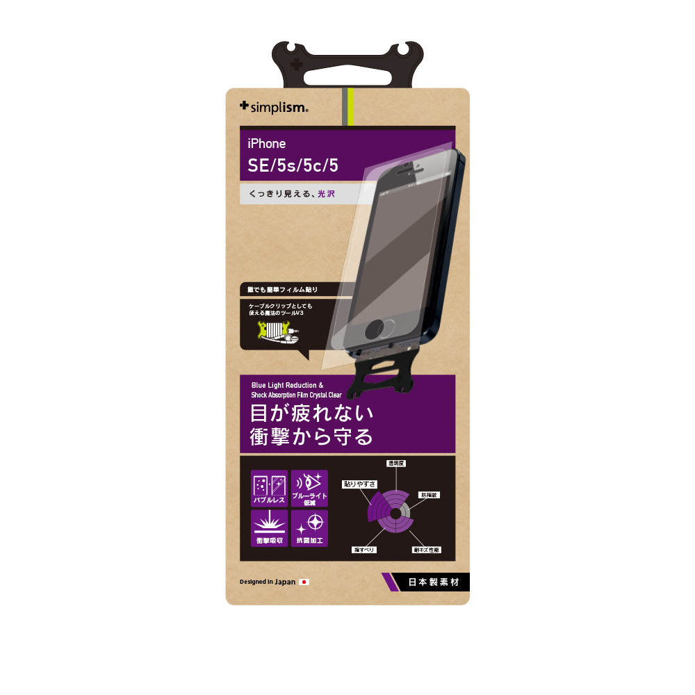 SimplismのBlue Light Reduction & Shock Absorbing Film for iPhone SE/5s/5c/5 Crystal Clear(衝撃吸収&ブルーライト低減 液晶保護フィルム)は、LEDディスプレイが発するブルーライトを減少させて目の疲労を抑える「ブルーライト低減」、ディスプレイ面を強い衝撃から守る「衝撃吸収」、気泡を発生させずにフィルムを貼付できる「バブルレス」加工を施した多機能ハイブリッドフィルムです。