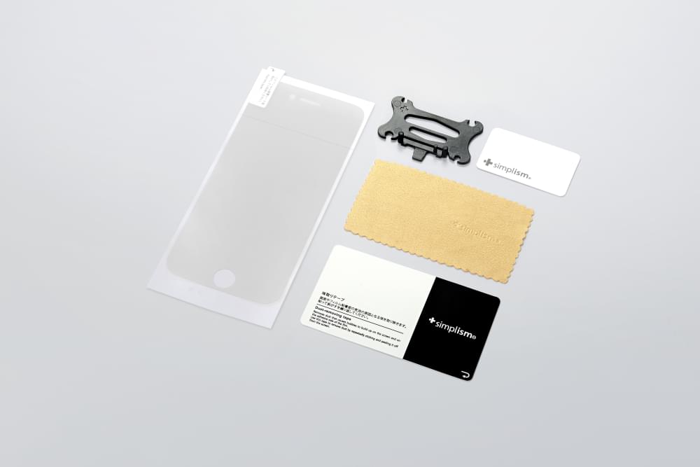 誰でも簡単に貼れるサポートアイテムを付属しました。貼付前に、マイクロファイバー素材のクリーニングクロスでディスプレイ上の指紋などの汚れを取り除き、埃取りテープを使い埃を完全に除去、気泡は貼付補助カードを使い押し出します。