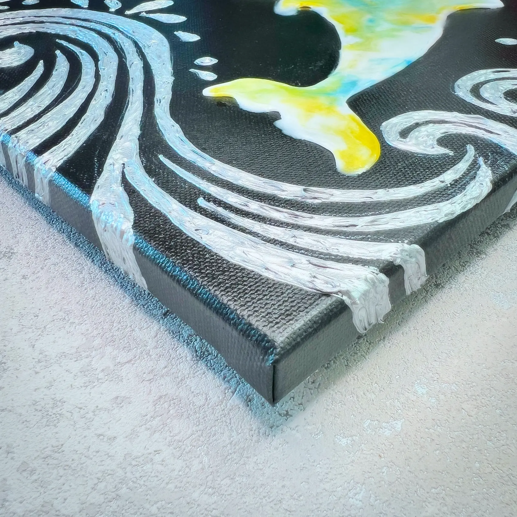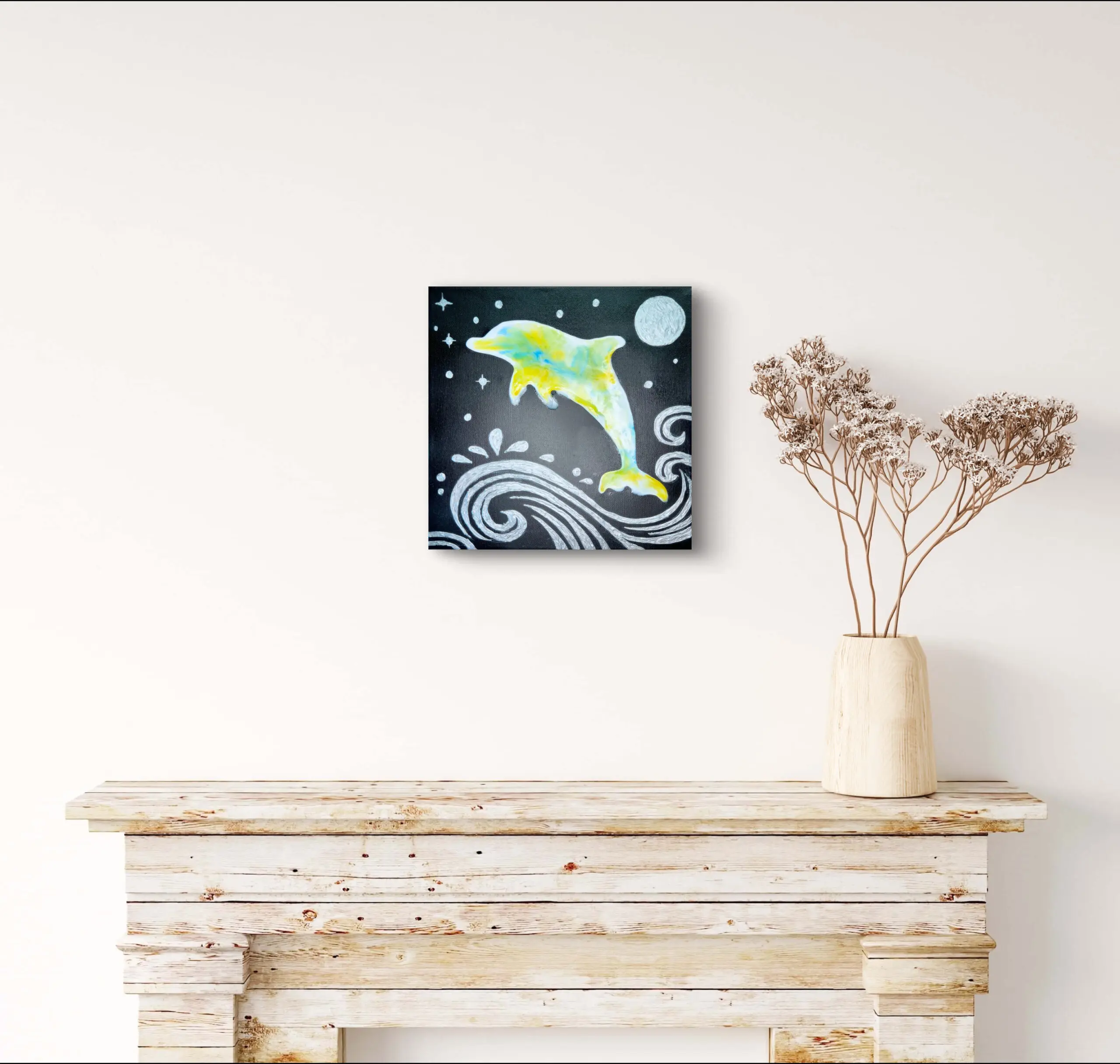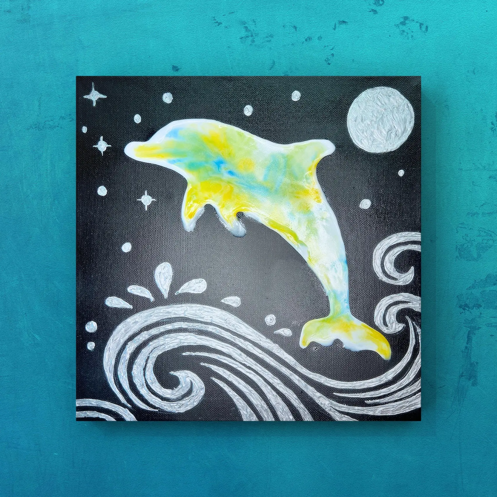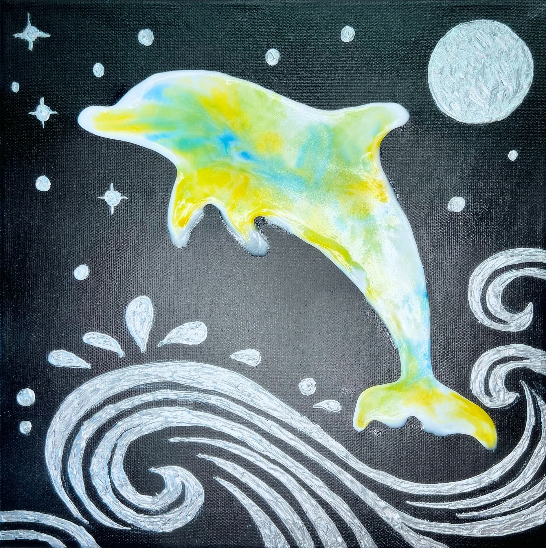 火を灯さずに愛でて楽しむ、キャンドル用のワックスで描いたアート作品。 シックな黒キャンバスをベースに、夜空の星々と月明かりに照らされながら、銀色の波間を舞うイルカを描いています。 鮮やかな色合いと幻想的な雰囲気が美しく調和し、まるで海の中にいるかのような気分にさせてくれる一枚。 リビングや寝室、玄関など、どんな場所にもぴったり調和します。 自然の息吹と遊び心をテーマにしたこの作品は、お部屋に華やかさと癒しをプラスし、見る人の心に深い印象を残します。 ぜひ、この美しい世界を楽しんでください。