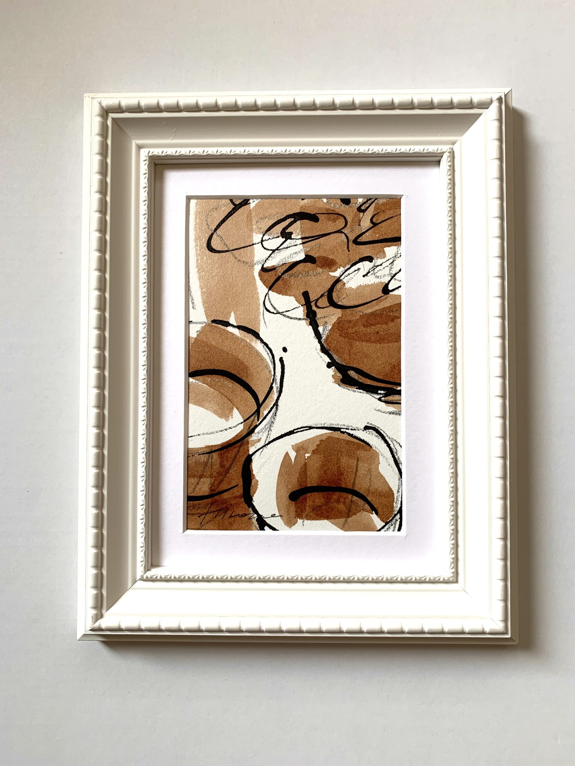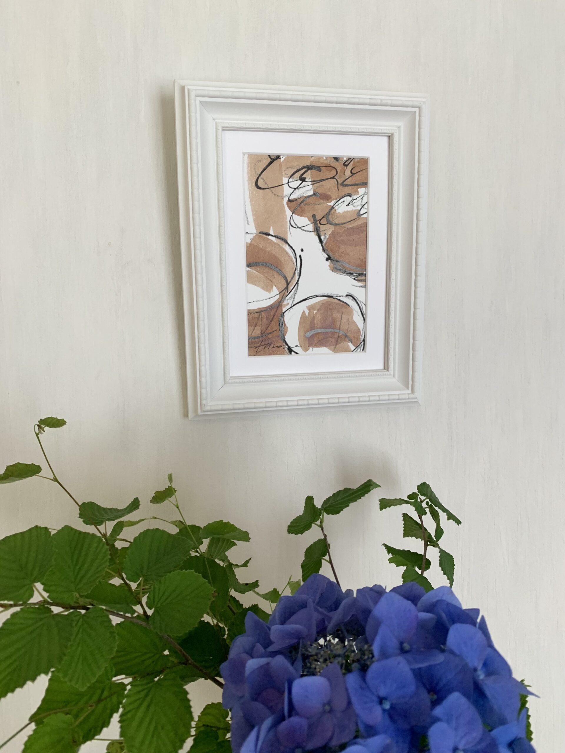 竹和紙に柿渋・チャコールペンシル・墨を使用しています。軽やかなタッチで静物画を描きました。額はフォトフレームです。立て掛けたり壁に掛けたりできます。小さいサイズなので場所を選ばず飾っていただけると思います。