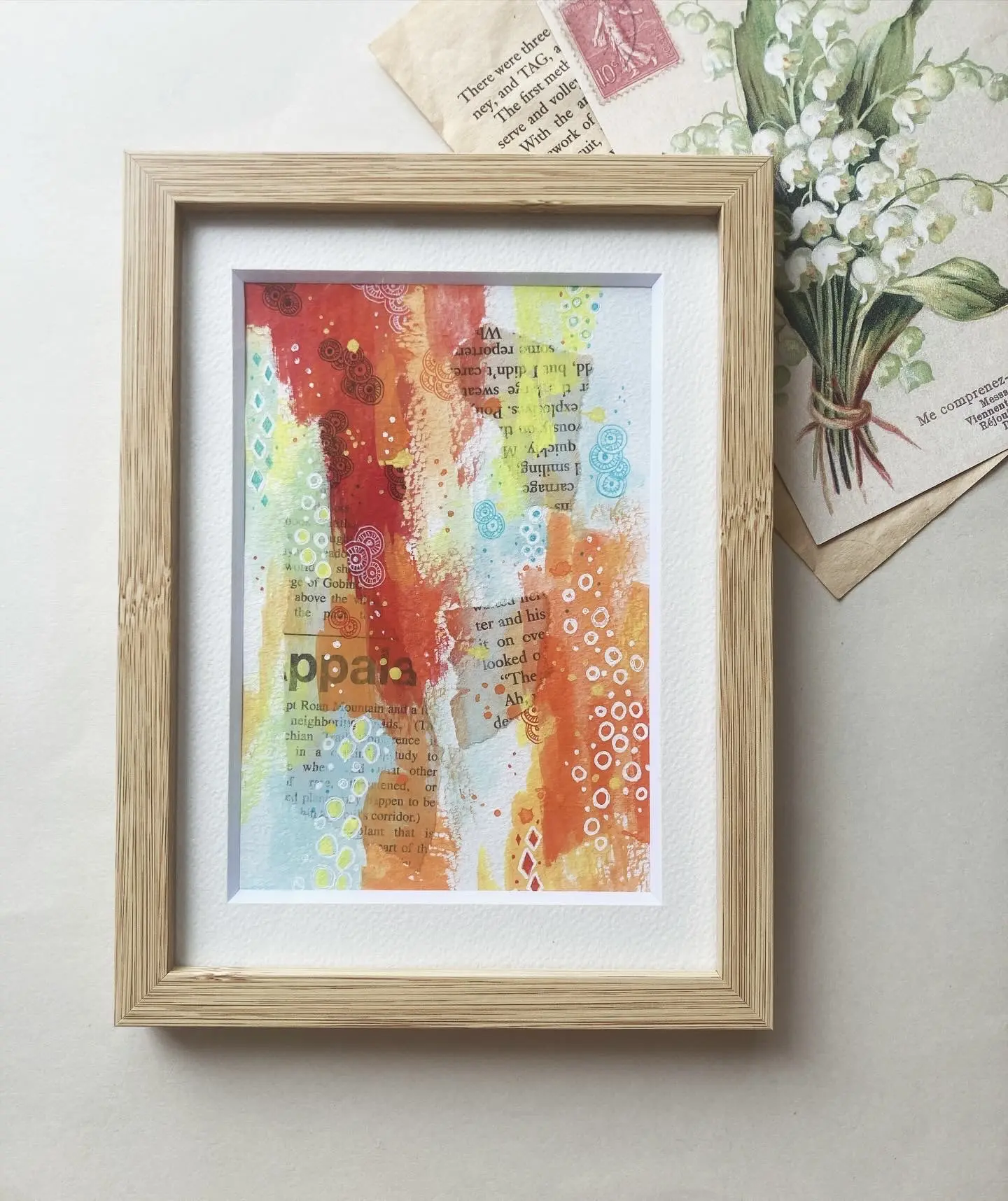 【仕様】 サイズ:100×148mm 額装サイズ:約140×200mm 素材:紙、古紙、アクリル絵の具、ペン 制作年:2024年 サイン:裏面にあり 額装付き 【制作技法について】 絵の具やインクを垂らして偶然出来た模様に ペンで線画を描いています。