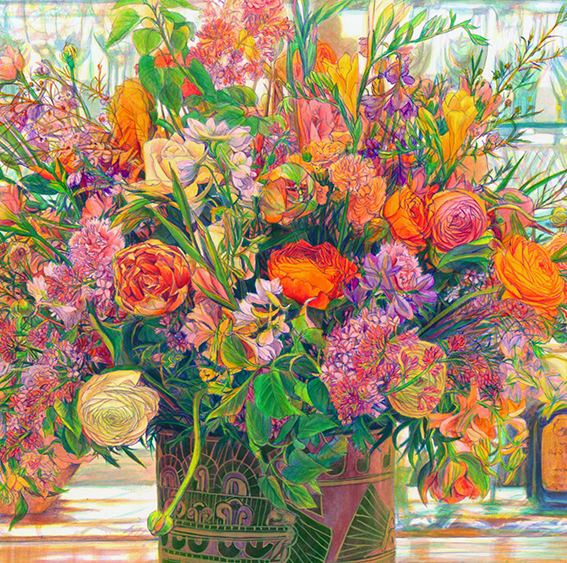 アクリル絵の具で絵を描いています。(写真を加工して絵にしたものでは無いです。)以前にヨーロッパへ絵の取材旅行へ行った時にフランスのホテルのバーに飾ってあった花がとても雰囲気が良かったので描いた絵です。