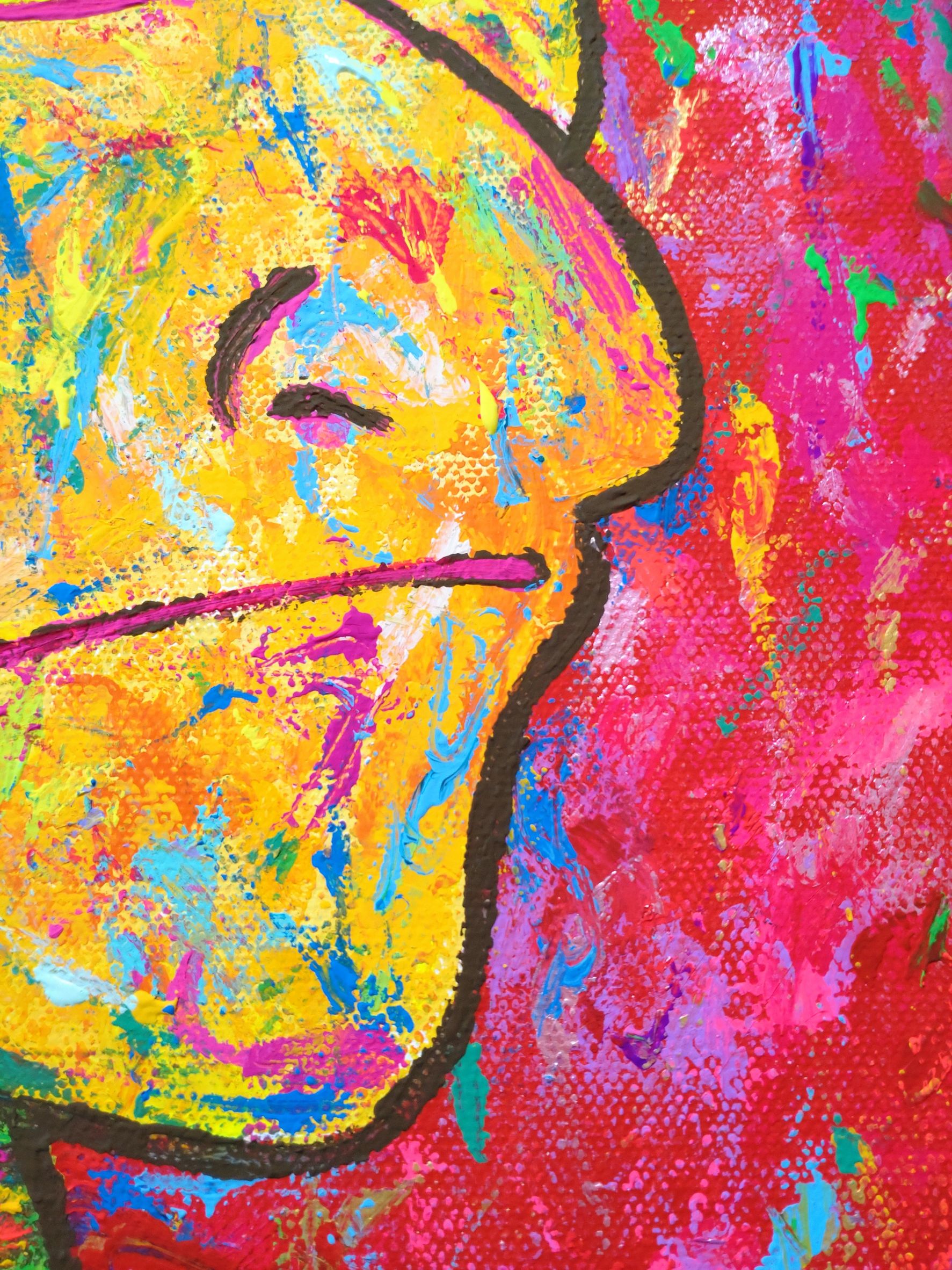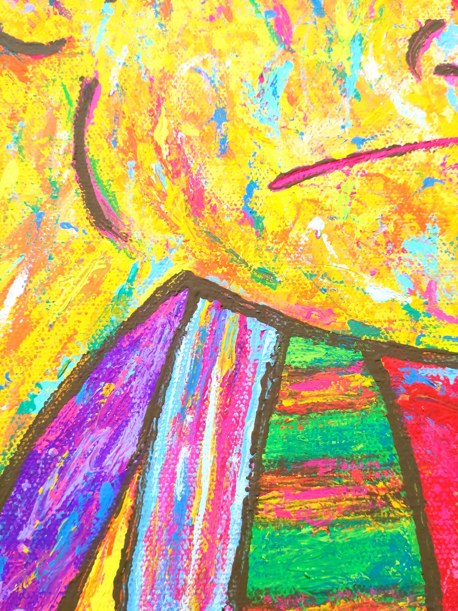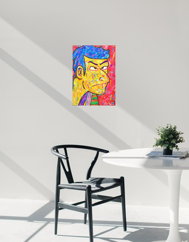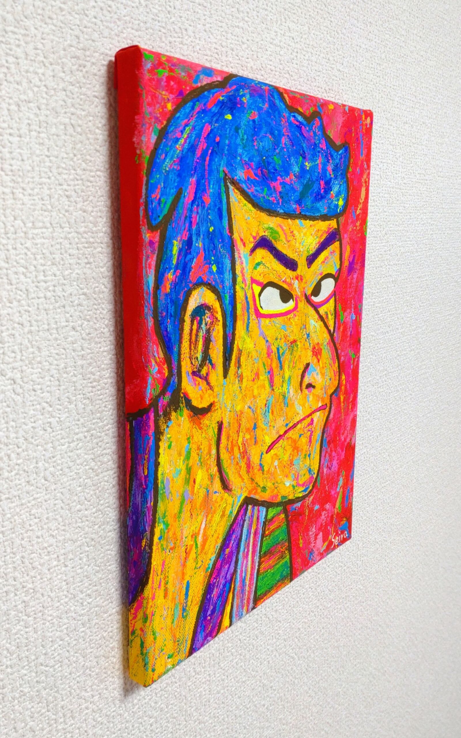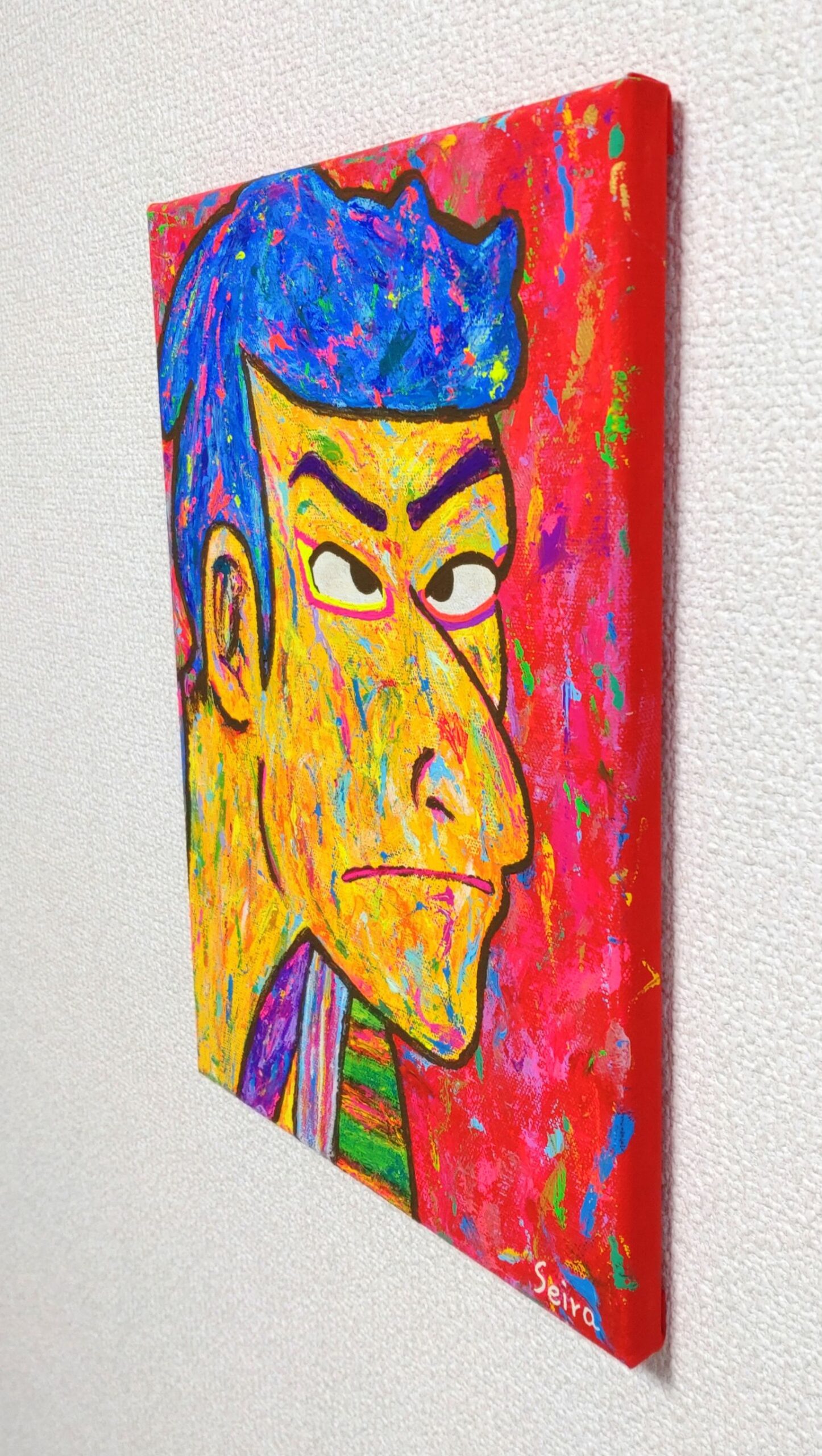 キャンバスのうしろに紐がついておりません。ピンにひっかけていただくと簡単&すぐに展示していただけます。(ふちの部分も色を塗っているので、そのまま飾ることができます。)