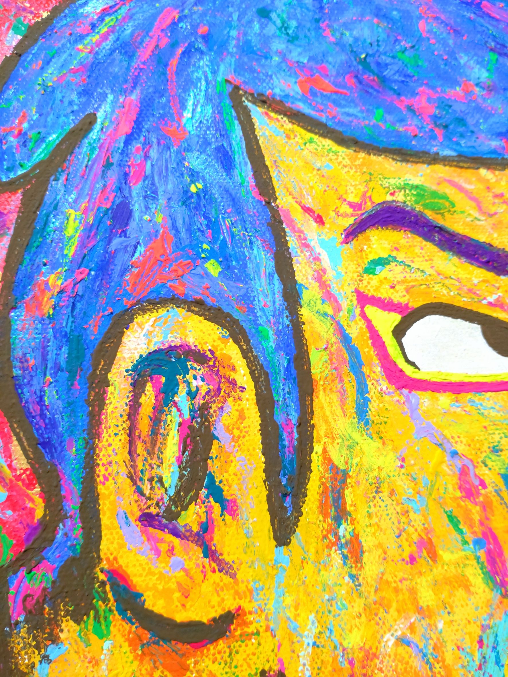 以前描いた「髪の毛がねこだったりして」という作品の色違い&少し大きいサイズバージョンを描きました。髪の毛に猫耳っぽいものがあって、ねこかな?と自分の髪の毛を見ているところを描いています。作品のポイントは目です。目の白いところはパール系の絵の具を使っているので少しキラっとします。