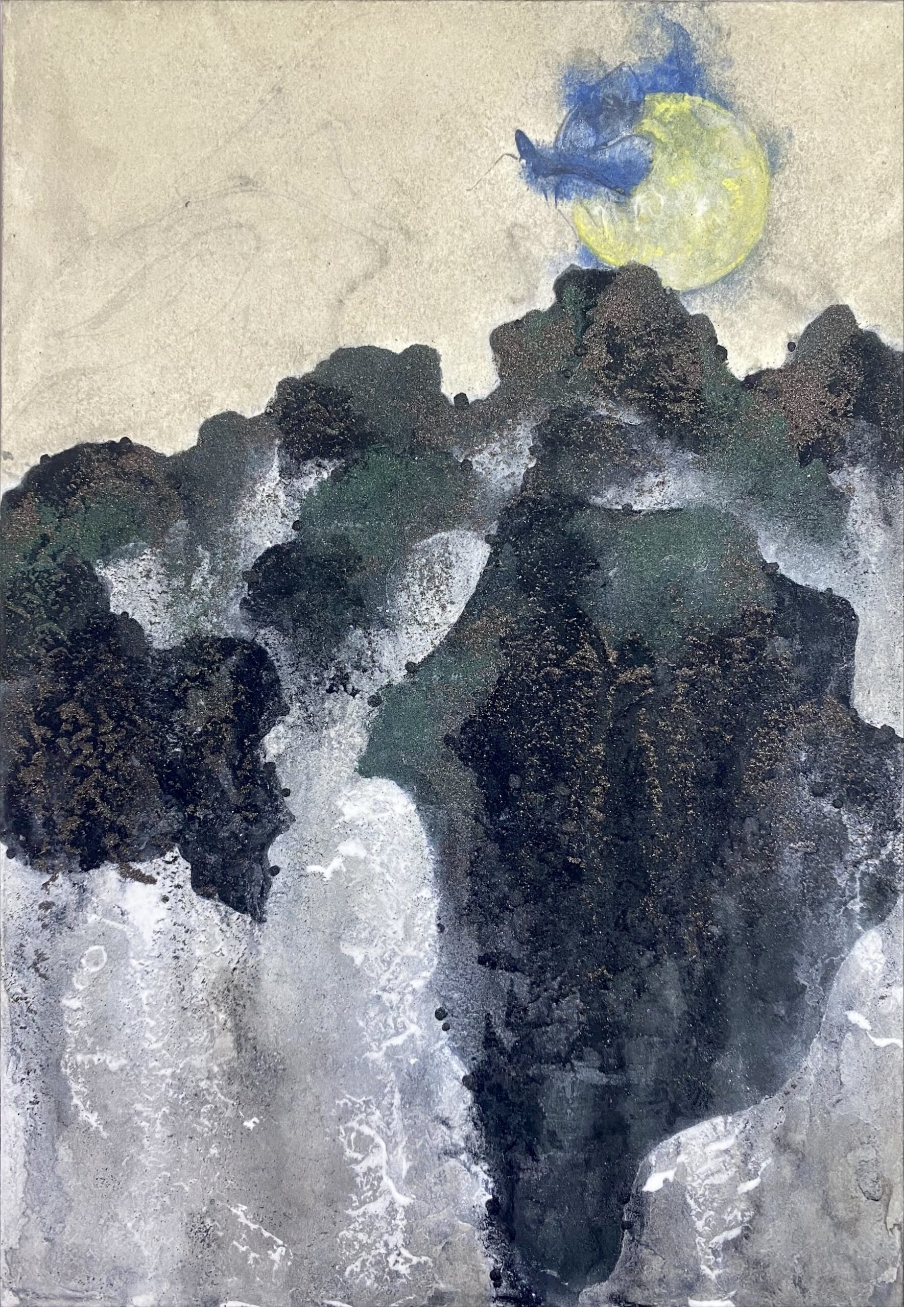 長い時間をかけて変形した岩の表現を山水画として成立させました。形の強さや色の表現で「巌」になった姿を描きました。