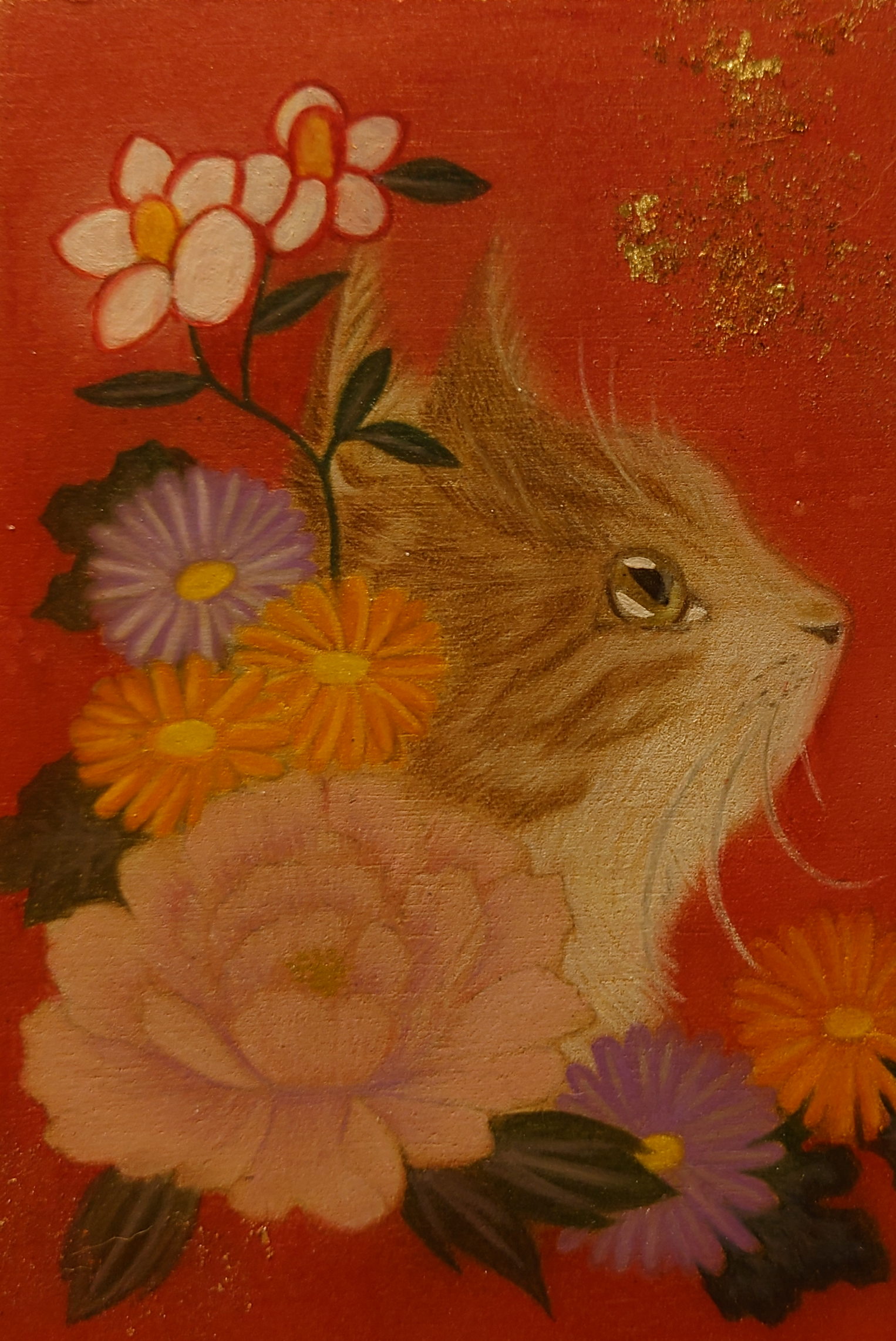 たくさんのお花、赤い背景にキラキラ✨したホイルフレークを散らした華やかな1枚です!(^^)(MDFボード、油彩色鉛筆、白筆ペン、ホイルフレーク)