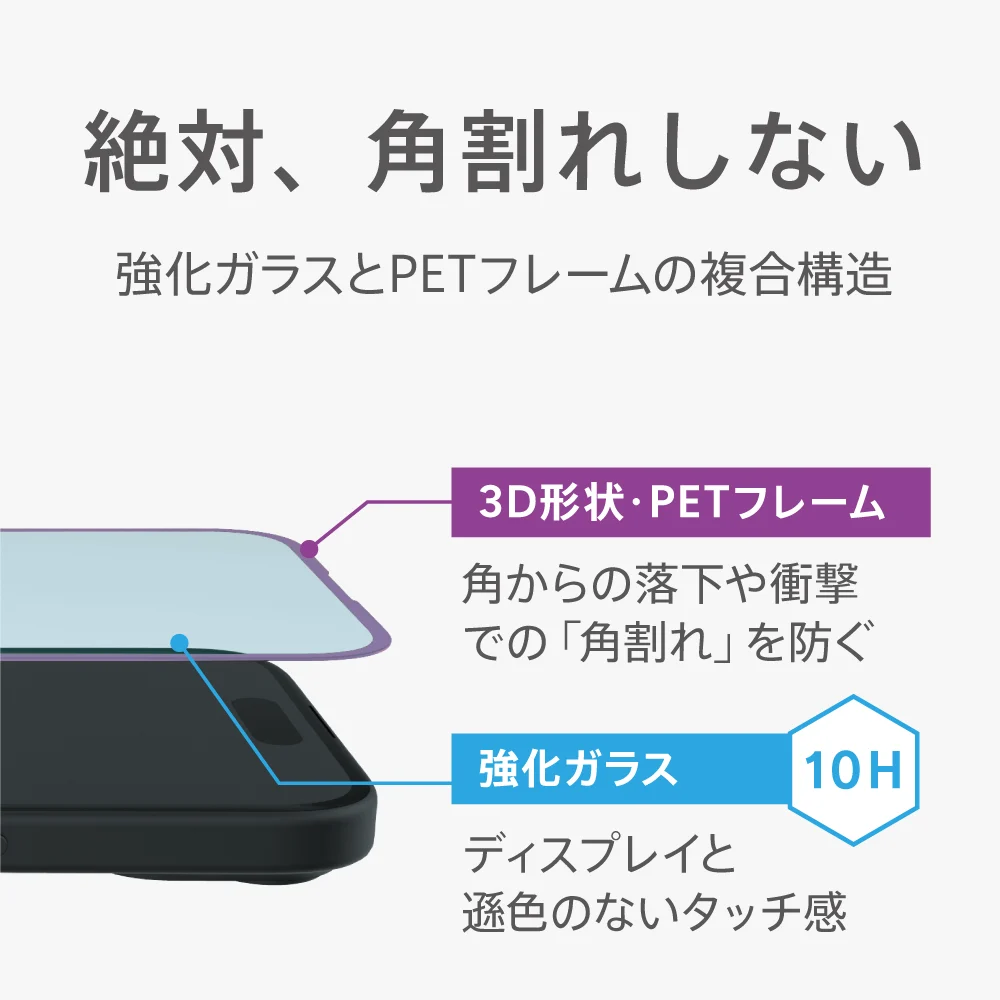 強化ガラスで画面の広範囲を保護し、端末本体の形状に沿った立体成型のPETフレームが周りを覆うことで、角からの落下や衝撃で起こる「角割れ」を防ぎます。