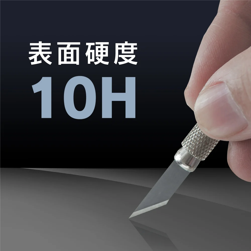表面硬度は一般的なフィルムの4倍以上の「最高硬度10H」レベルで、特に擦り傷に対しての強い耐性を持ち、たとえカッターでも傷つけることができません。