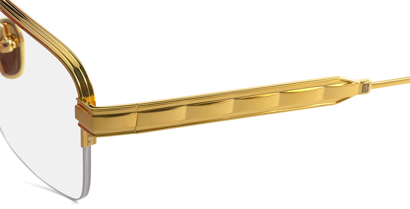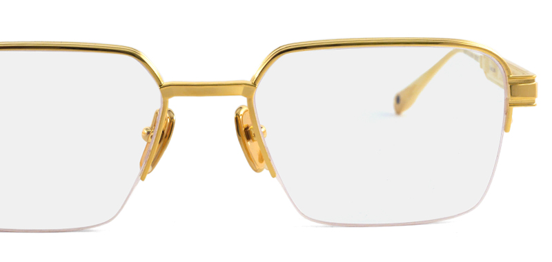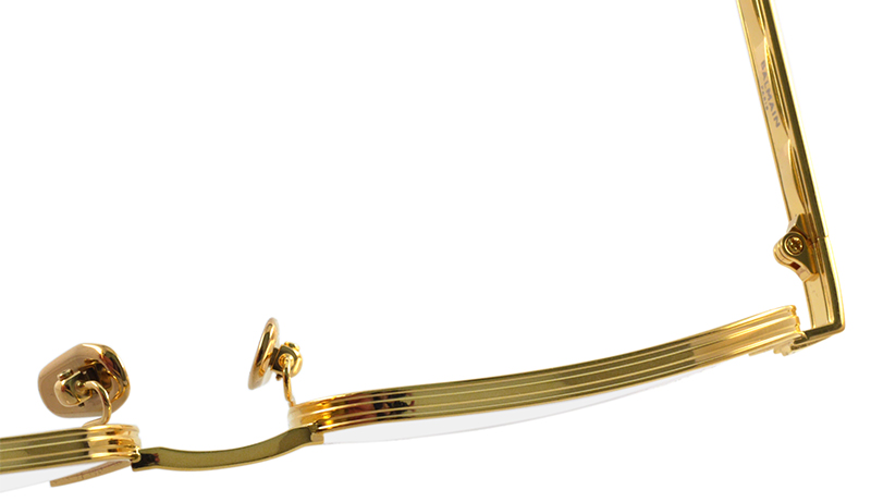 クラシックなデザインながらも非常に印象的なハーフリムのチタンフレーム。アイコニックなチェーンモチーフのテンプルは、ナポレオンの高い地位を示すために軍服に装飾されたエギュイエット(ゴールドの三つ編の飾り紐)から着想したもの。ライン入りのリムなど全てにおいてラグジュアリーなメタルフレームです。 サイズ:レンズ横幅55mm 縦幅39mm レンズ間距離19mm フロント幅141mm 素材:チタン 生産国:日本