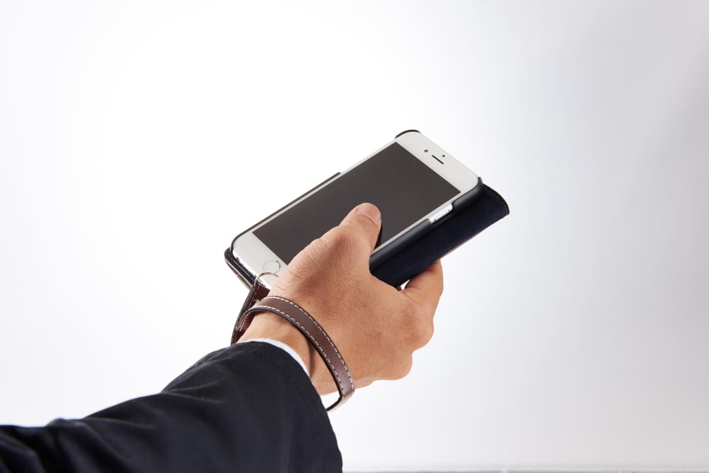 ケースの生地に合わせたハンドストラップを付属しています。使い勝手を考慮して、一般的なストラップよりもループを大きくしました(ループ内寸120mm)。手首を通したままでの画面操作がしやすく、iPhoneを万が一の落下からしっかりと防ぎます。