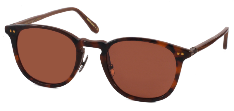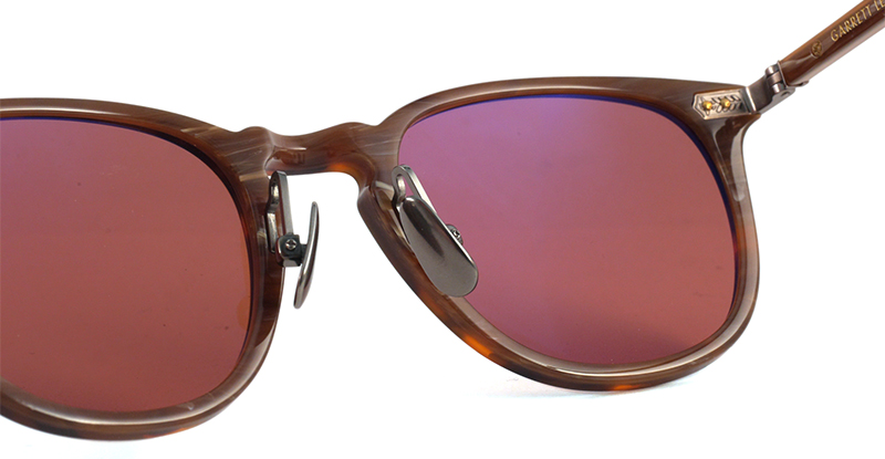 線が細くメガネ感覚でナチュラルに着用できるデザイン、カルフォルニアの柔らかい雰囲気はそのままに、日本製の繊細な仕上げでより高級感が増しました。蝶番金具には日本でも馴染み深い植物シダの模様が刻印されています。チタンパッドが装着されており、掛け心地も非常に良いサングラスです。