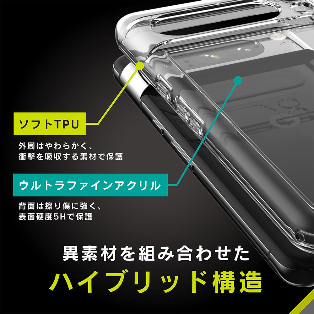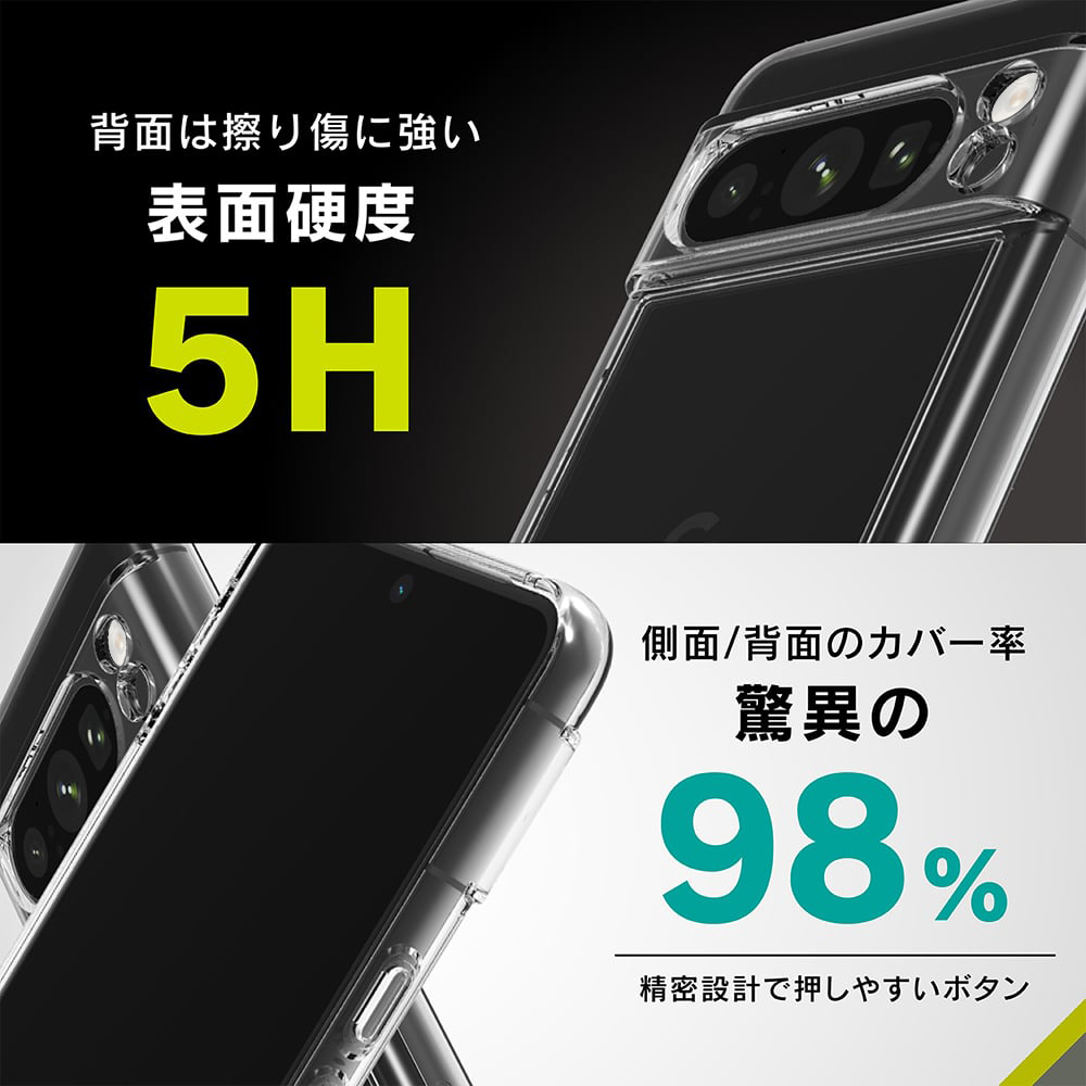 背面を表面硬度5Hの超硬質素材、側面をやわらか素材で傷や衝撃から守り、カメラ周りまでしっかり保護するハイブリッド構造のクリアケースです。