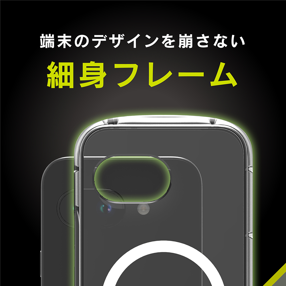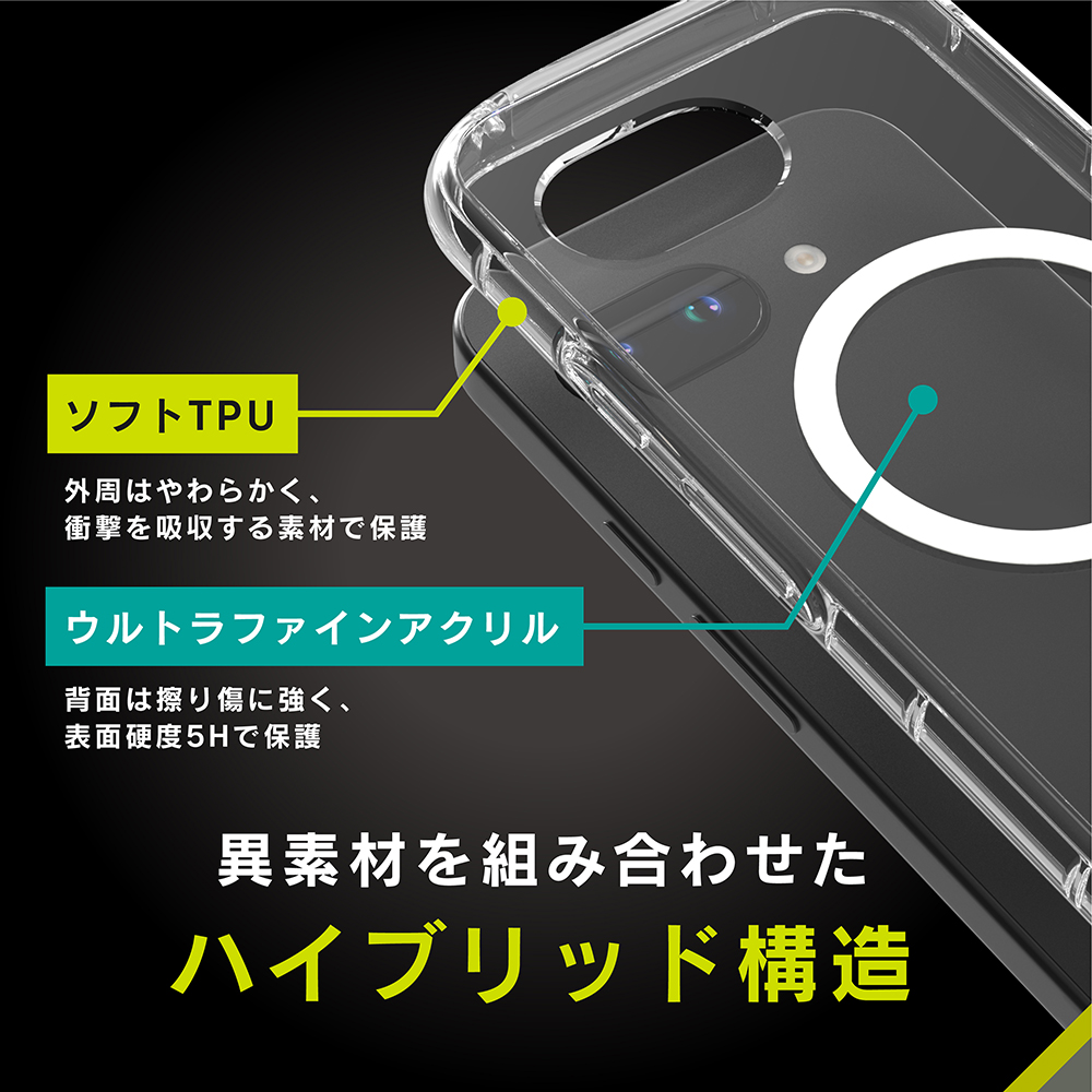 表面硬度5Hの超硬質素材と、しなやかなTPU素材を使用したハイブリッド構造クリアケース。細身フレームのシンプルなデザインながら端末をしっかり守る。各種MagSafeアクセサリーとの併用が可能。