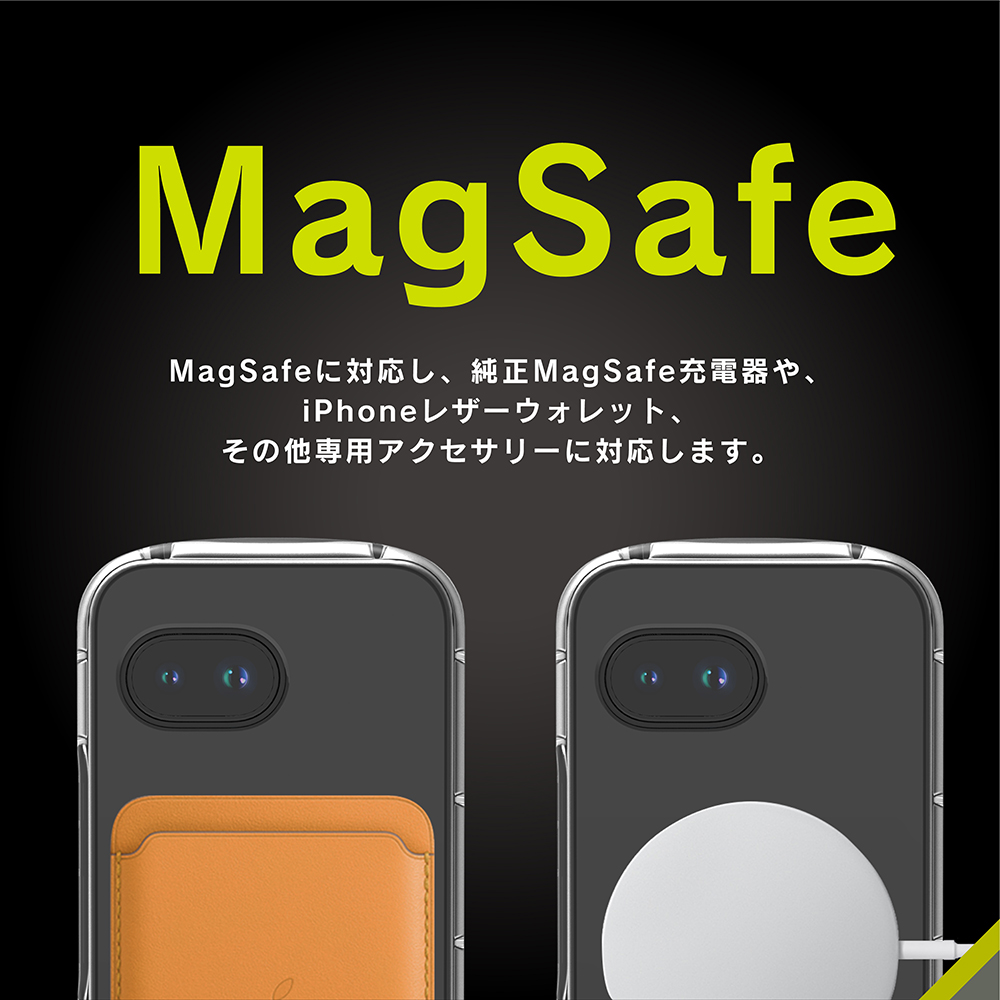 各種MagSafeアクセサリーに対応し、純正MagSafe充電器や、iPhoneレザーウォレット、その他専用アクセサリーに対応します。