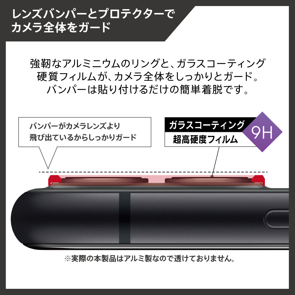 強靭なアルミニウムのリングと、ガラスコーティング硬質フィルムが、カメラ全体をしっかりとガード。貼り付けるだけの簡単着脱です。
