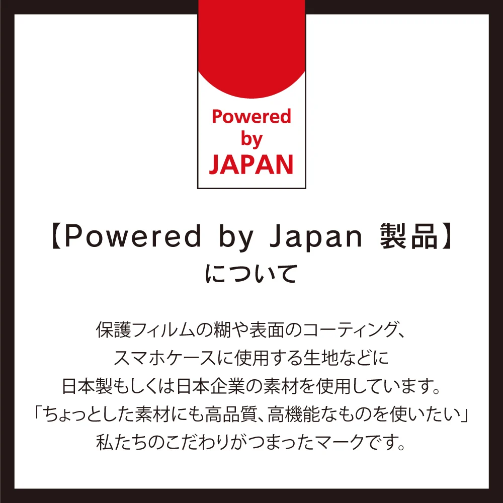 保護フィルムの糊や表面のコーティング、スマホケースに使用する生地などに日本製もしくは日本企業の素材を使用しています。「ちょっとした素材にも高品質、高機能なものを使いたい」私たちのこだわりがつまったマークです。