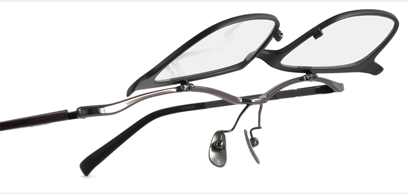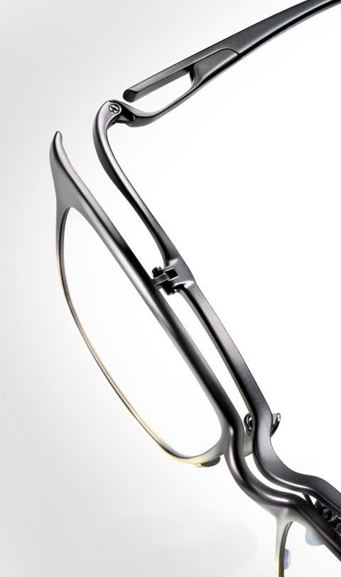 最高峰の跳ね上げメガネを目指した意欲作。生命が感じられるような有機的フォルムを最高峰の技術によりチタンで表現しています。跳ね上げ丁番は最高の精度を実現する為に、一般的なロー付けではなく、金型プレスと切削加工の一体で作り出し、さらにネジのタップ数を増やすことでスムーズ且つより持続性のある機構を追求しています。