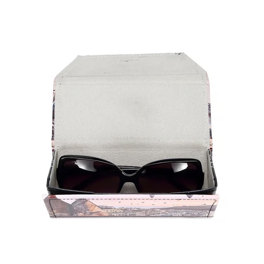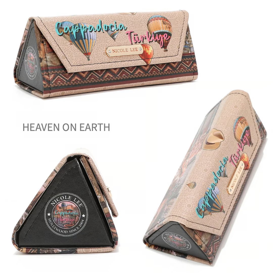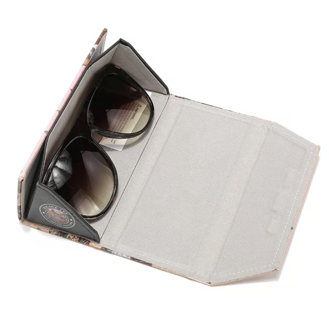 オリジナルのnicoleleeプリントで装飾されたスタイリッシュでコンパクトな折り畳み式メガネケース。