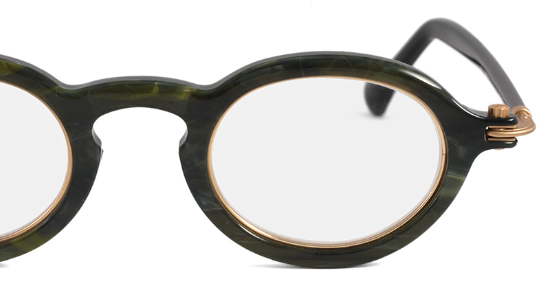 レンズサイズ小さめ、程よいボリューム感とキーホール型ブリッジが特徴のオーバルフレーム。メタル素材のインナーリムを採用しており、角度により異なる表情、メタリックな輝き、高級感がとても素敵なメガネです。