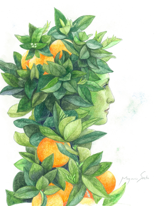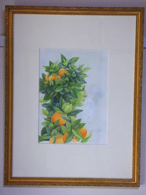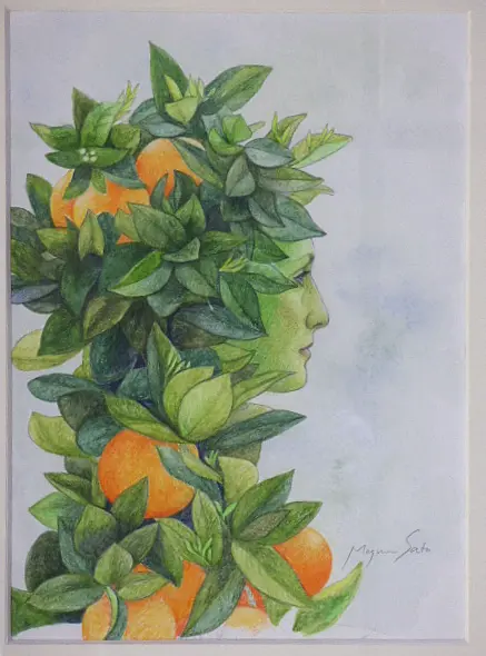 私の実を食べなさい この熟した果実を通して 今あるすべてのことが 我らの生と あなたがたの生に 豊かさをもたらすことを 知るだろう 木霊シリーズの1作品です。 水彩紙に、鉛筆、水彩色鉛筆、ガッシュを使って丁寧に書いた1点物の水彩画です。 額縁はアンティークゴールドで落ち着いていますがゴージャスです。 展示使用品で古いものになりますので、サービスでお付けしております。