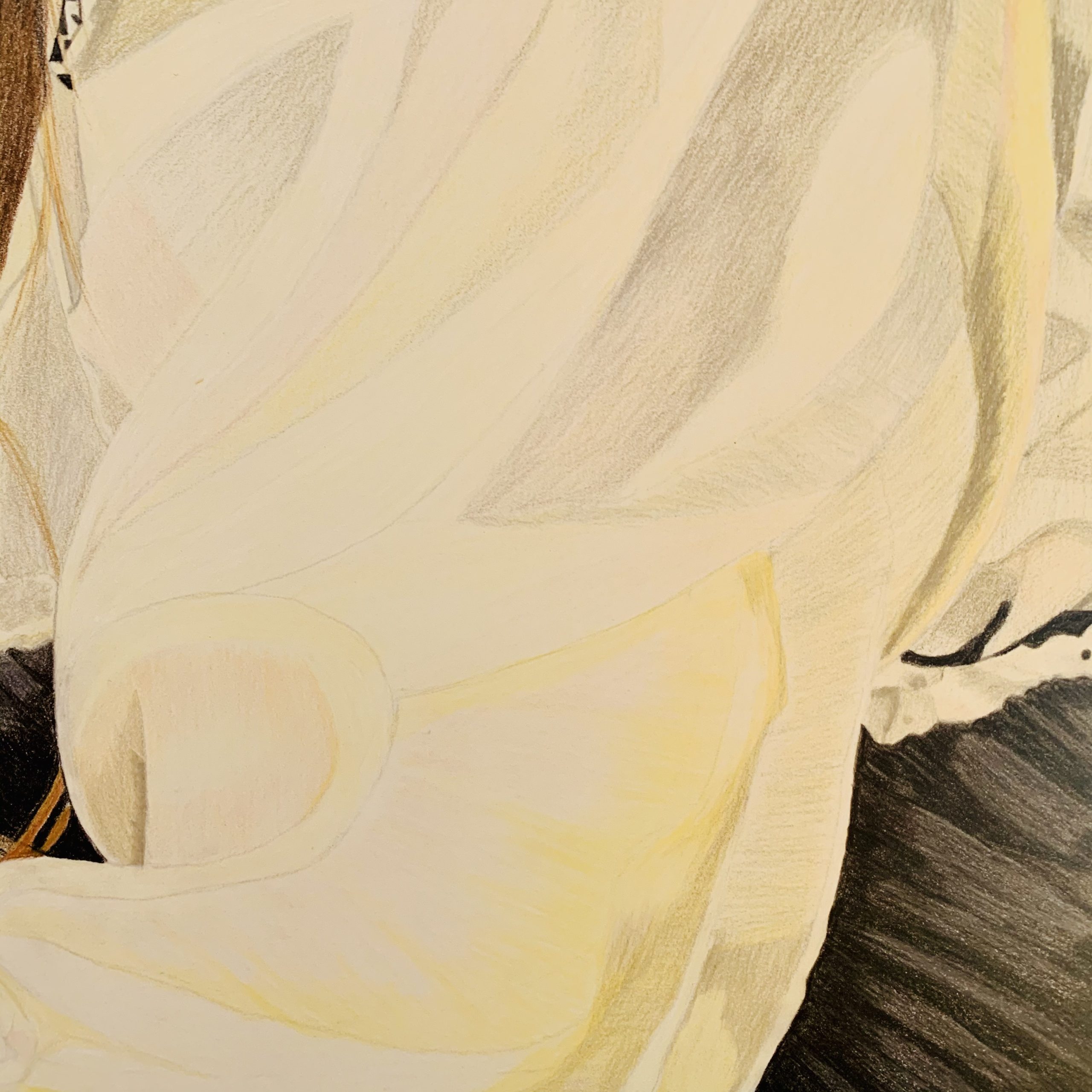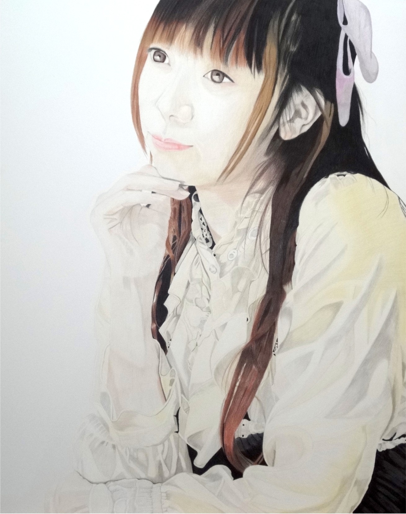 100%のフル色鉛筆です。特にファションもですが色鉛筆画としては珍しい「白」を多用している作品です。